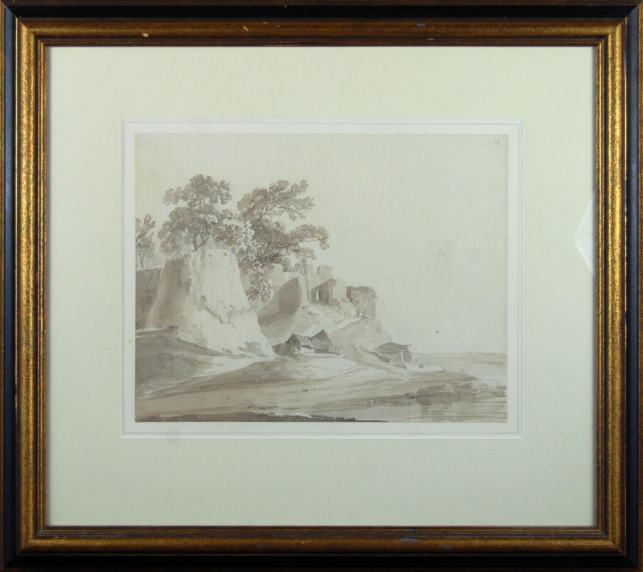 he four watercolors in this collection are completed in numerous and varied tones of grey. Three of the images are landscapes: one with a cliff with trees above and a shoreline below; the second depicts a shoreline with trees on the left; and the third is a landscape with a small group of trees in the center. The fourth image is a small Indian cart with a fringed awning overhead.Artwork Details