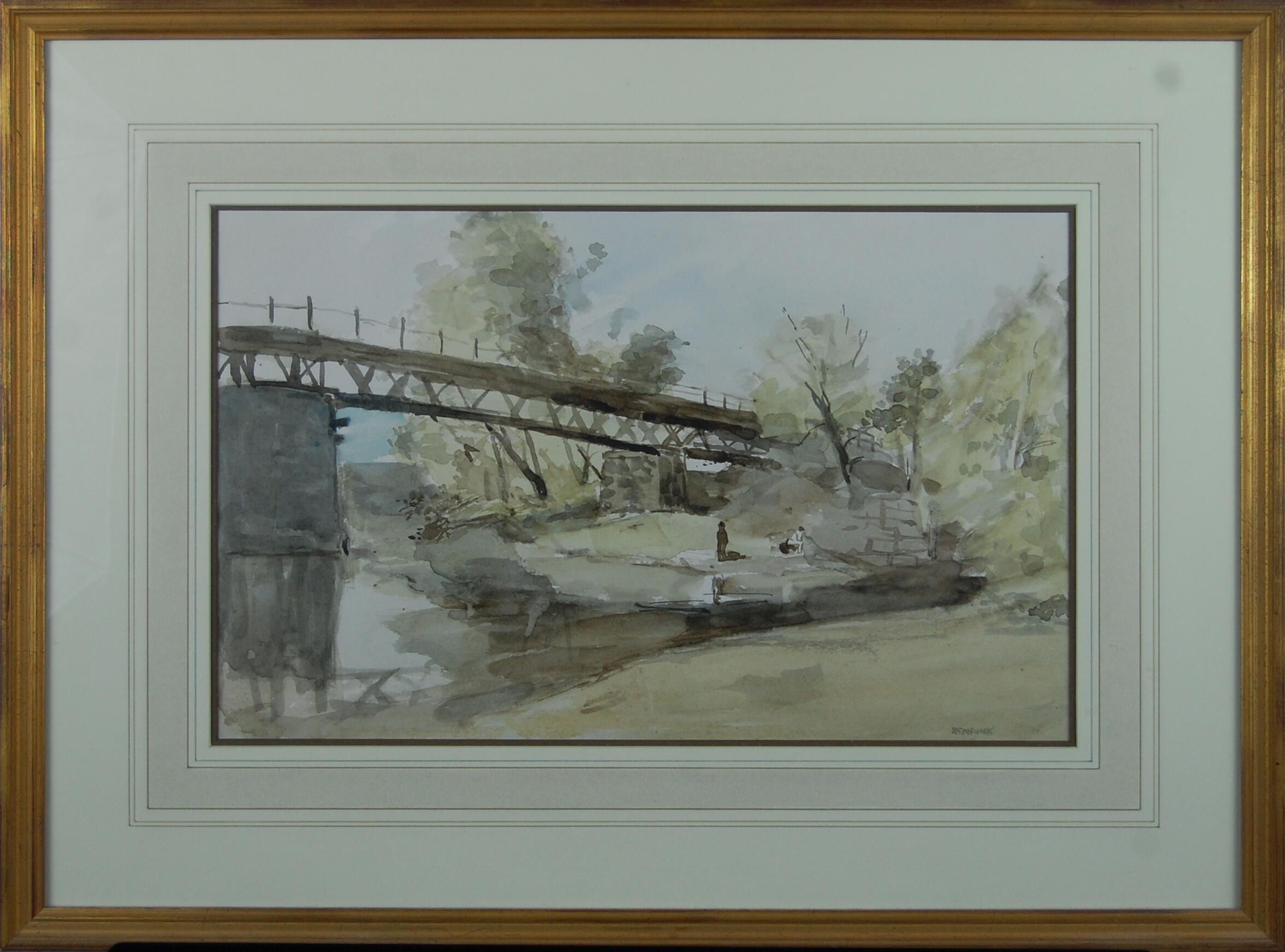 In this work, Remenick has depicted a country landscape, typical of the work for which he is most known. A small bridge over a body of water reflects in the water below. Painted in muted tones of greys, pale greens and a light wash of blue in the sky, this landscape includes two small figures at the water's edge. Several trees reach above the bridge, silhouetted against the sky. This work is painted using the quick brushstrokes typical of the artist.Dimensions