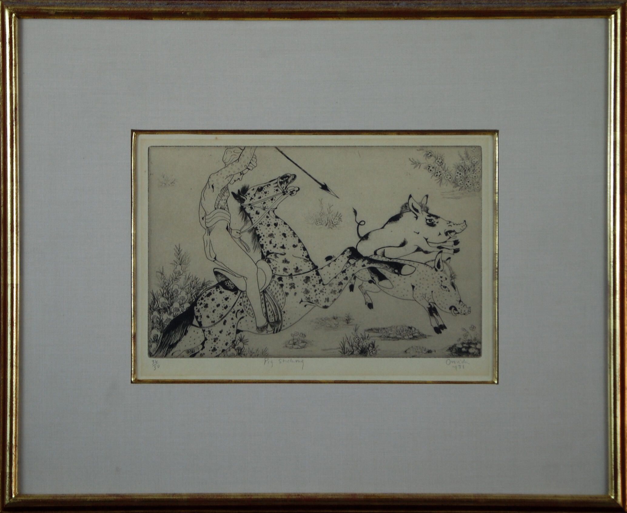 A man wearing a turban on a rearing horse decorated with stars and dots hold a spear above his head about to "stick" two wild pigs running in front of him. Small amounts of landscape, branches with pine needles, fills the comers of the black and white image.Made/Created