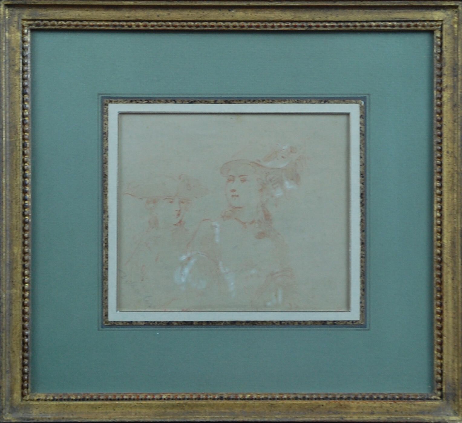 Description: This sketch from the Vicar of Wakefield shows the upper bodies of two figures rendered in red and white chalk. The woman wears an ornate hat with plumes and the few additional details suggest ornate clothing. The gentleman, shown behind her and to her right, wears a tricorn hat. Few details of clothing are included in his depiction. The figures are shown against a minimal background. The sketch of the woman is likely one of the vicar's daughters who is courted by various people in the neighborhood. After the Vicar loses all his money due to a bad investment, his various sons and daughters scramble and the family moves to lesser quarters. This image may be a sketch for a final drawing of daughter Sophia and her suitor, Squire Thornhill. This story was widely read in the Victorian period in Great Britain.Dimensions