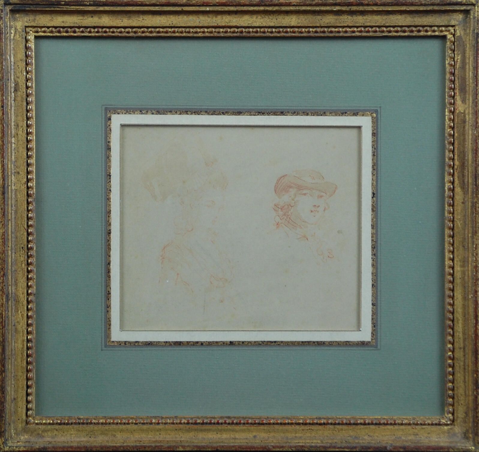 This sketch from the Vicar of Wakefield shows the upper bodies of two figures rendered in red and white chalk. The woman, very pale (faded) wears an ornate hat and is shown in three-quarter view. The gentleman to her left wears a hat with a narrow brim. Only his head is shown. He looks outward at the viewer.Dimensions