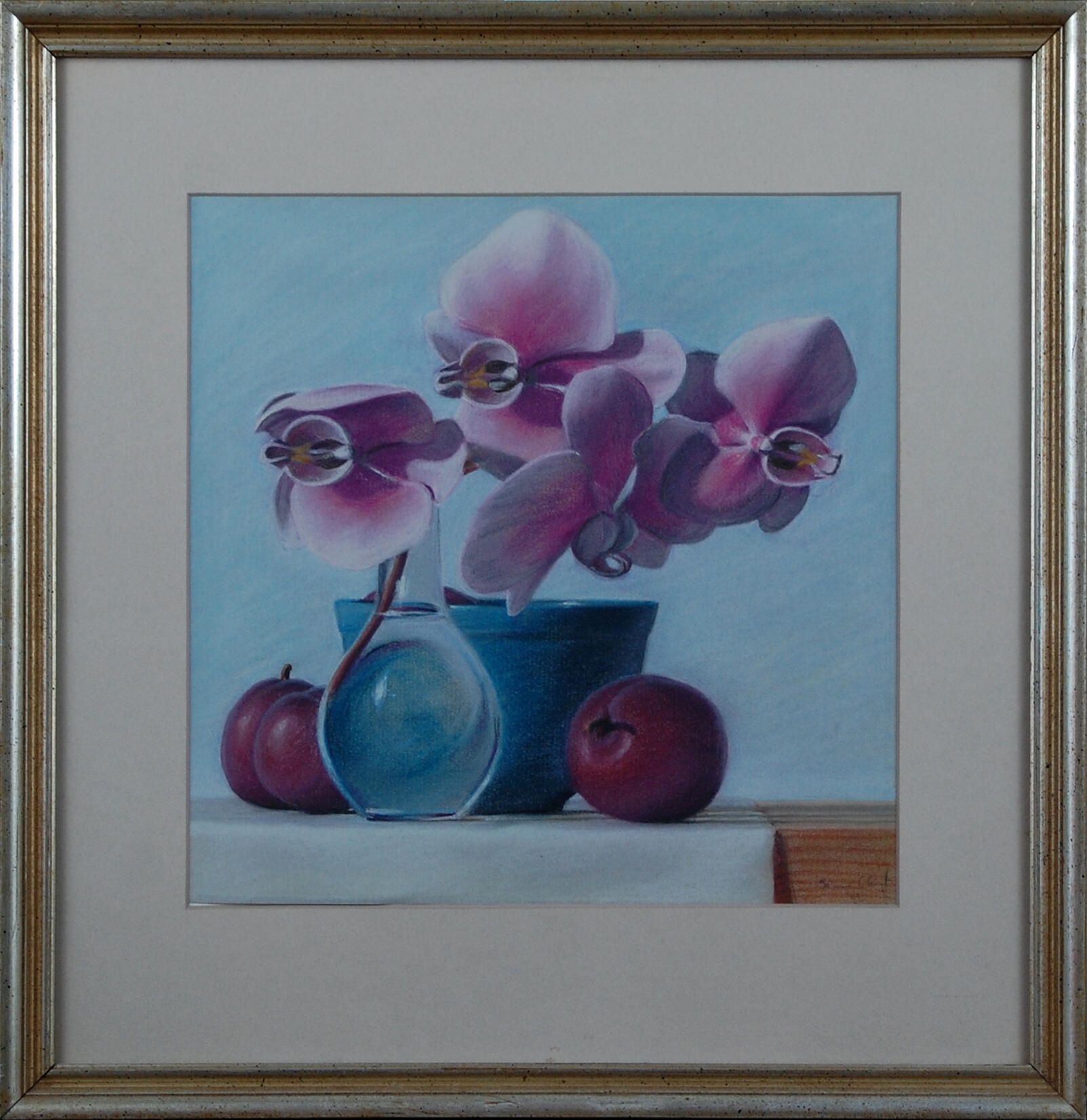 In soft and blended pastels, the artist depicted a blue bowl behind a glass vase that holds a stem with several pink and lavender orchids. Red apples sit on the white cloth covered surface that allows a small part of wood to show on the lower right. The still life is shown against a light blue background.Dimensions