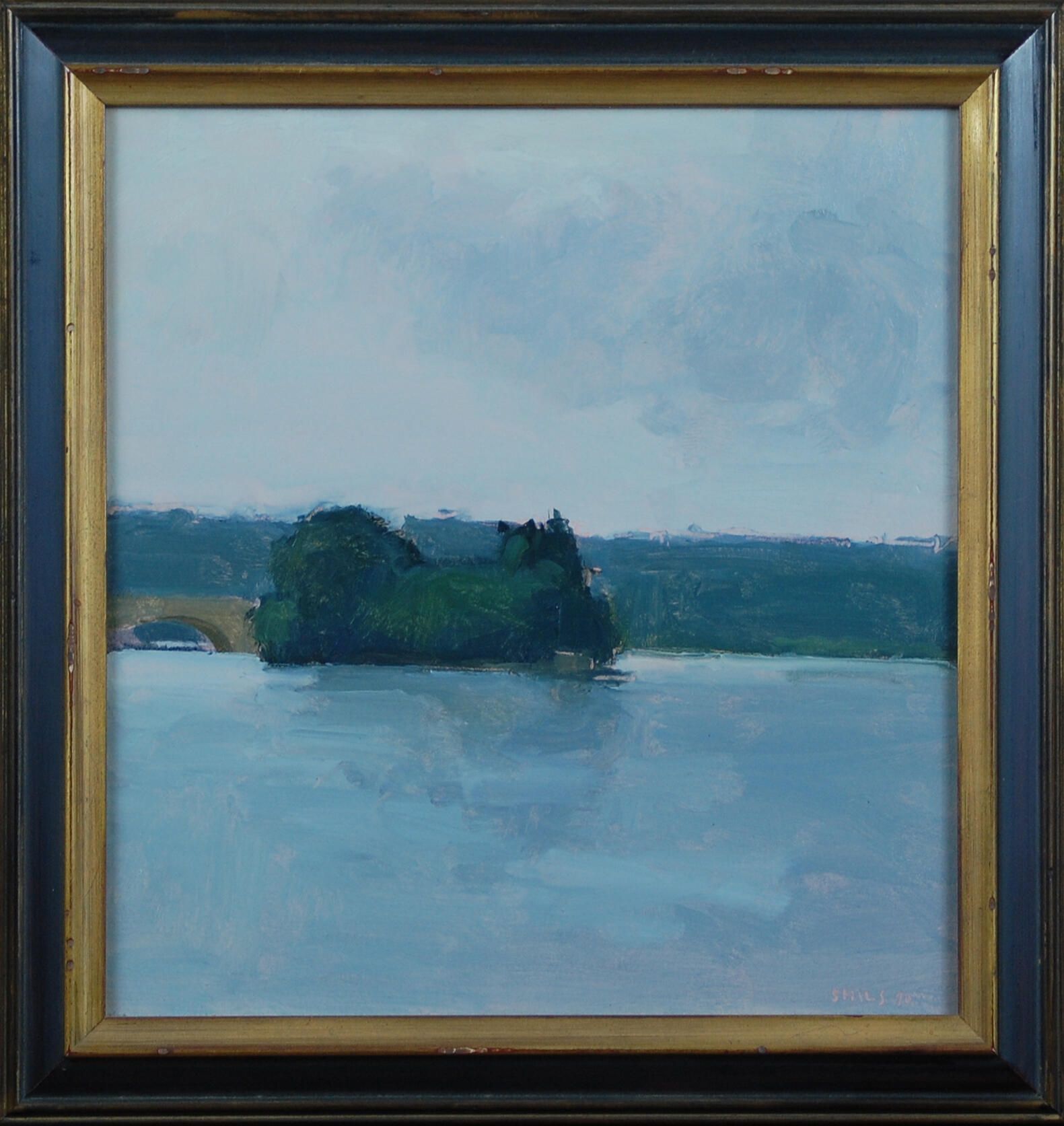 Bold brushwork captures this small island in the middle of the river. The expressionist strokes show the reflection of the island. To the left is a bridge. Underneath the blues are rose tones that emerge creating depth.Dimensions