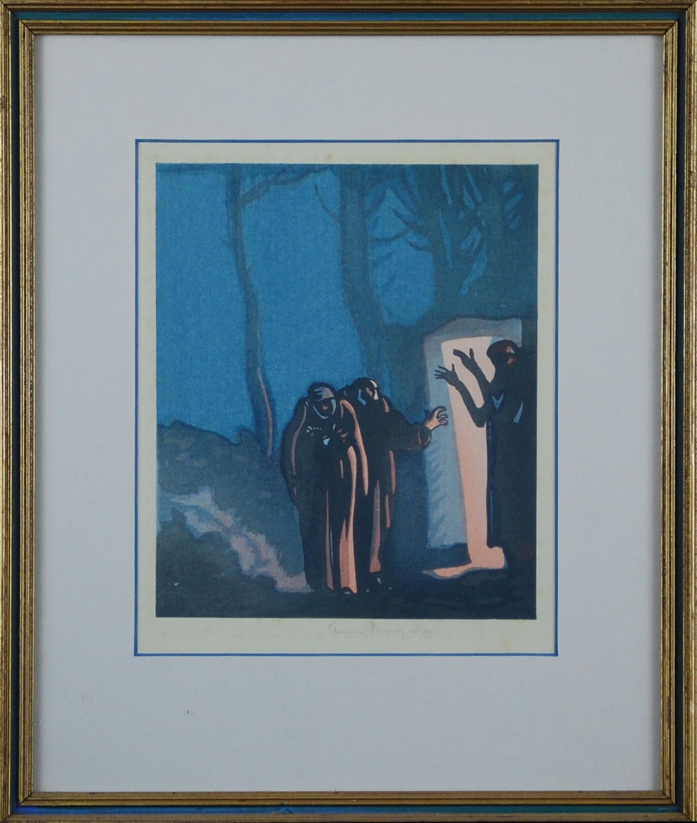 This print shows three holy women (possibly the three Mary's) at the tomb of Christ finding it empty as Christ has risen. The standing figures wear long robes and head coverings. The one in front of the tomb raises her arms exclaiming that a miracle has occurred. The women stand in a darkening landscape next to the lit opening in the foreground on the right. The blue background has several tall trees shown in silhouette above a rocky landscape on the left.Artwork Details