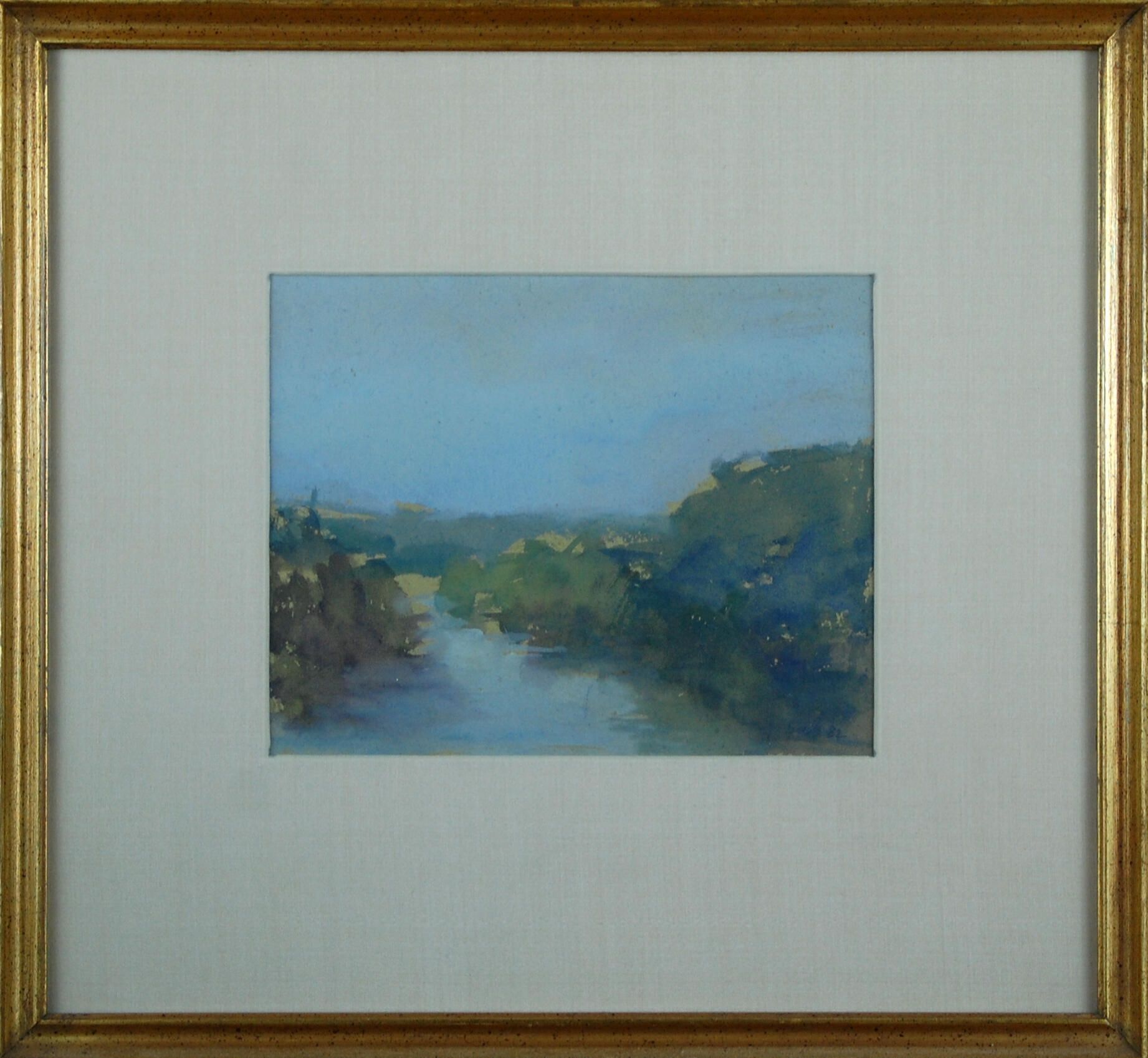 Green and brown cliffs are painted on one side of a blue river. Green trees and low flora are on both sides of the water in the middle ground. Overhead, the blue sky fills the composition.Dimensions