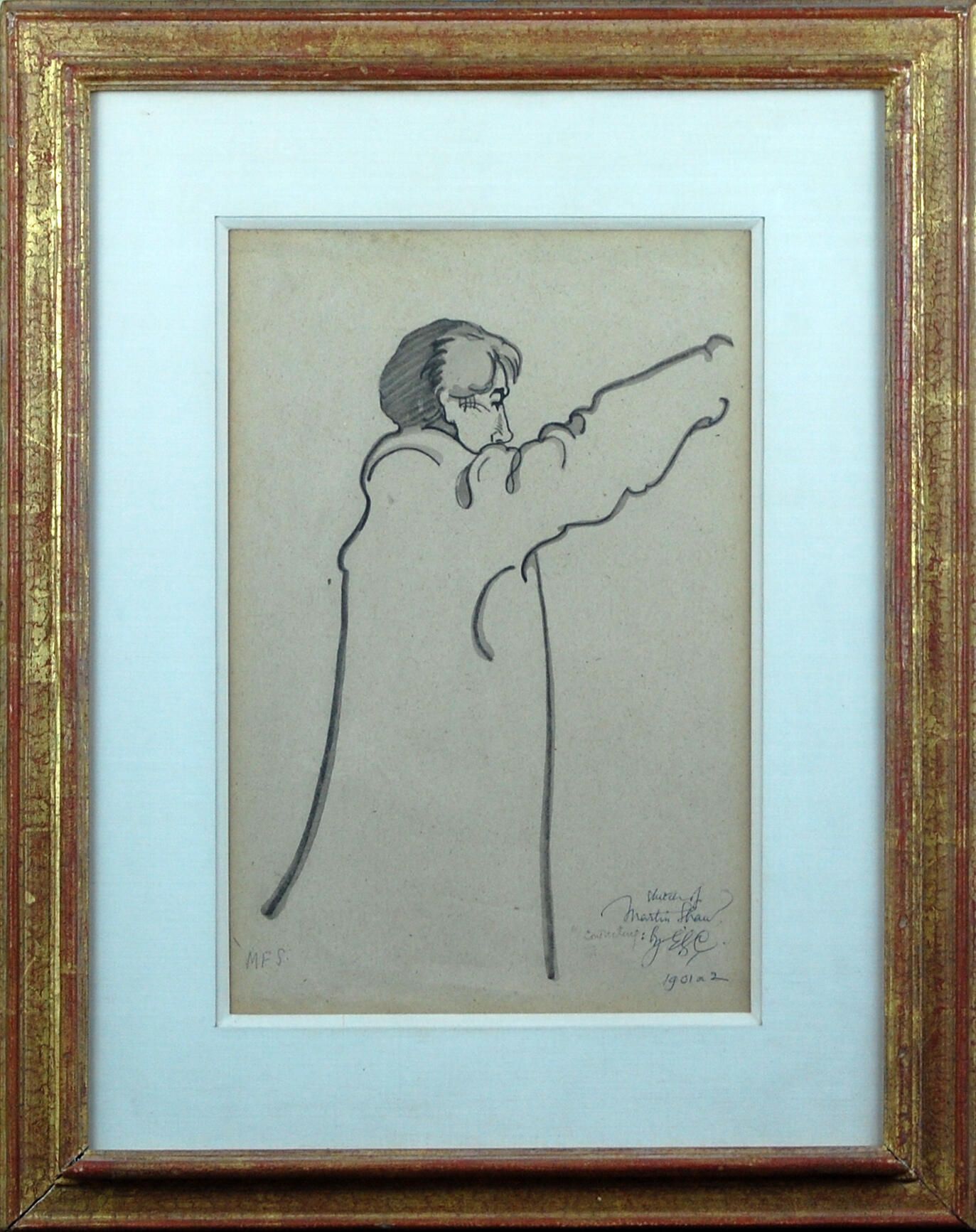 In minimal wide lines, Craig depicted Martin Shaw with a raised arm conducting. The full figure has no modeling. The conductor, Shaw, is shown from the side looking downward. Craig used minimal lines to define the features adequate to identify the figure. Shaw collaborated with stage designer Craig on his productions in England.Made/Created