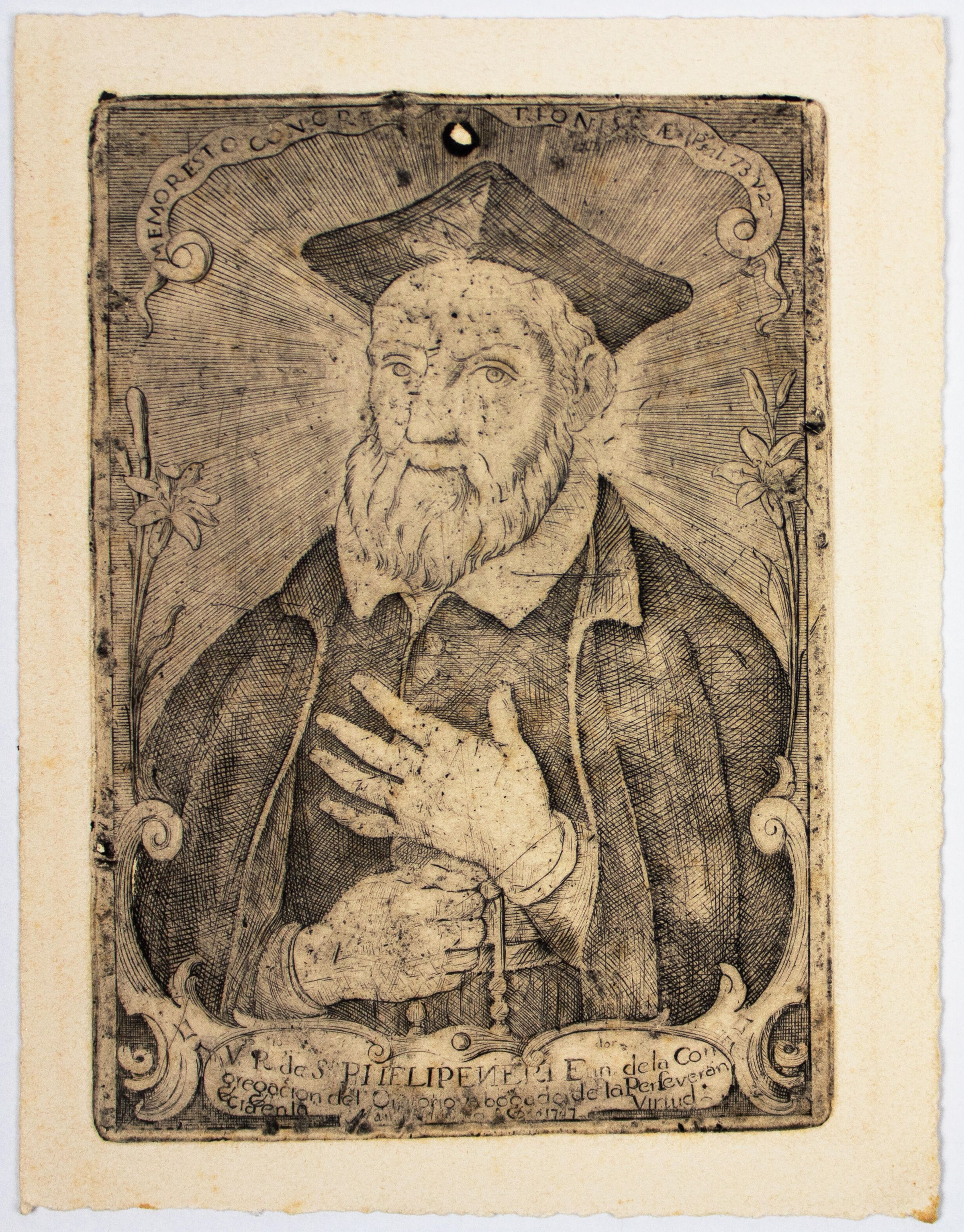 The copper plate which produced this print was found nailed to a wall in Mexico about 1970. It was restored by Bohuslav Horak who produced 10 prints from the plate. Engraver unknown.Exhibition