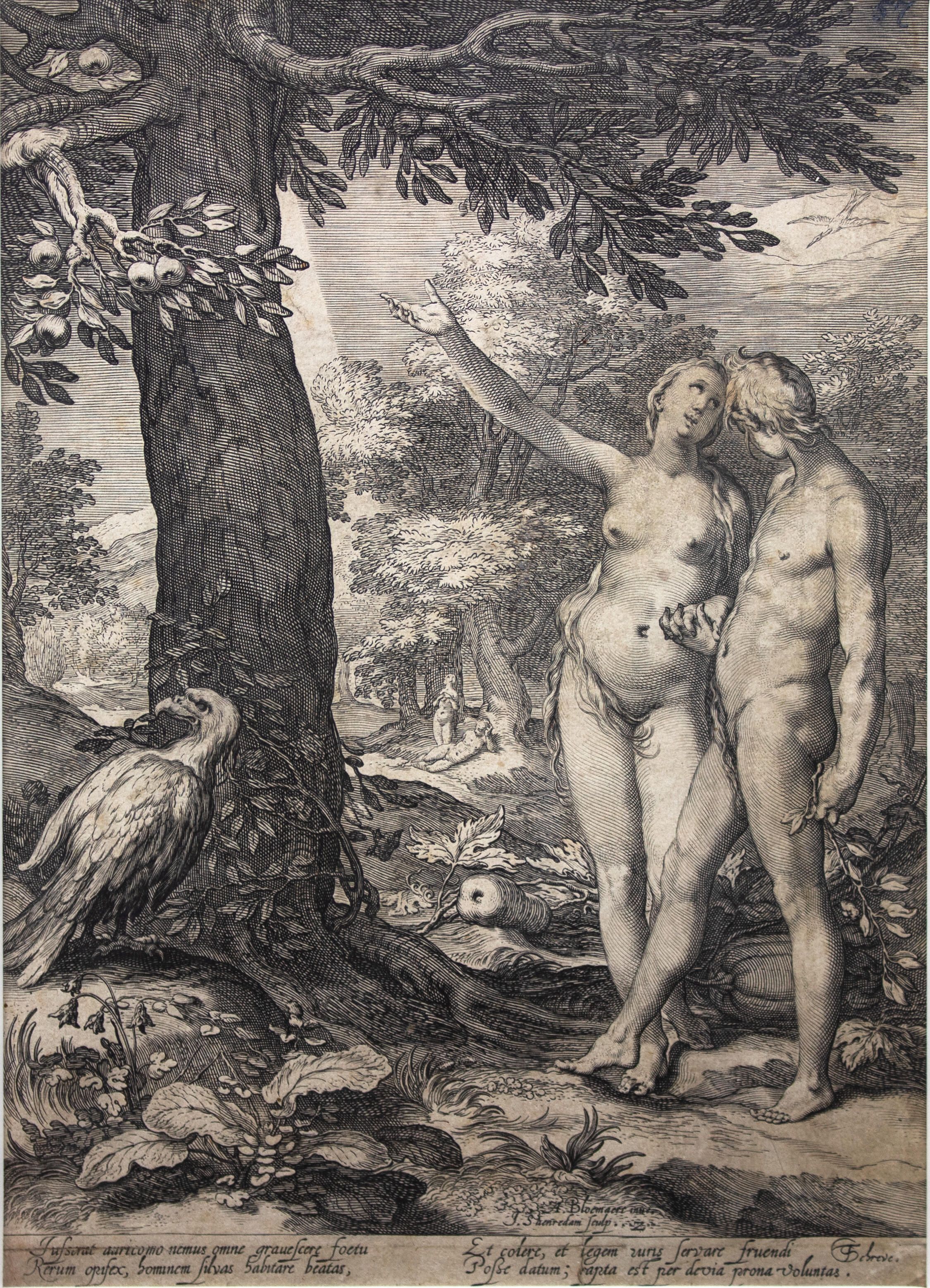 Etching by Jan Peitersz Saenredam (Dutch, 1565-1607) titled Adam and Eve Im Paradiese Waudelnol. Aus einer Folger G. Blattern No. 2. Framed. Text on bottom starts out "Iufserat aurico mo..."