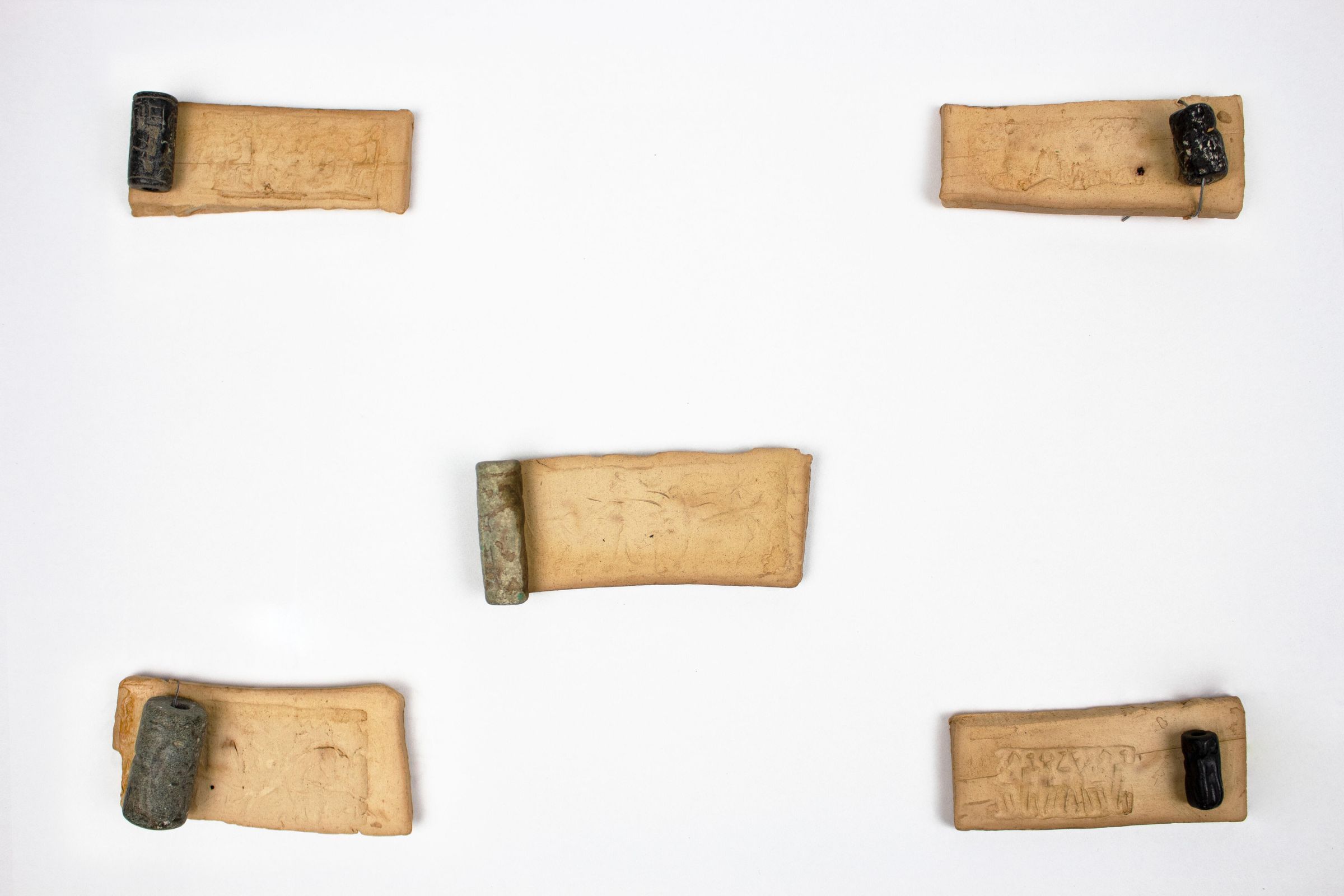 Seals were used in Mesopotamian region as early as the 7th millennium B.C.E. when nomadic groups began settling into agricultural societies. Cylinder seals became popular beginning around the 4th millennium B.C.E. Made of metals or soft stones like marble, the cylinder seals had carved images on the side and were rolled to leave impressions onto soft surface like clay tablet, which were used as writing surfaces during this period.