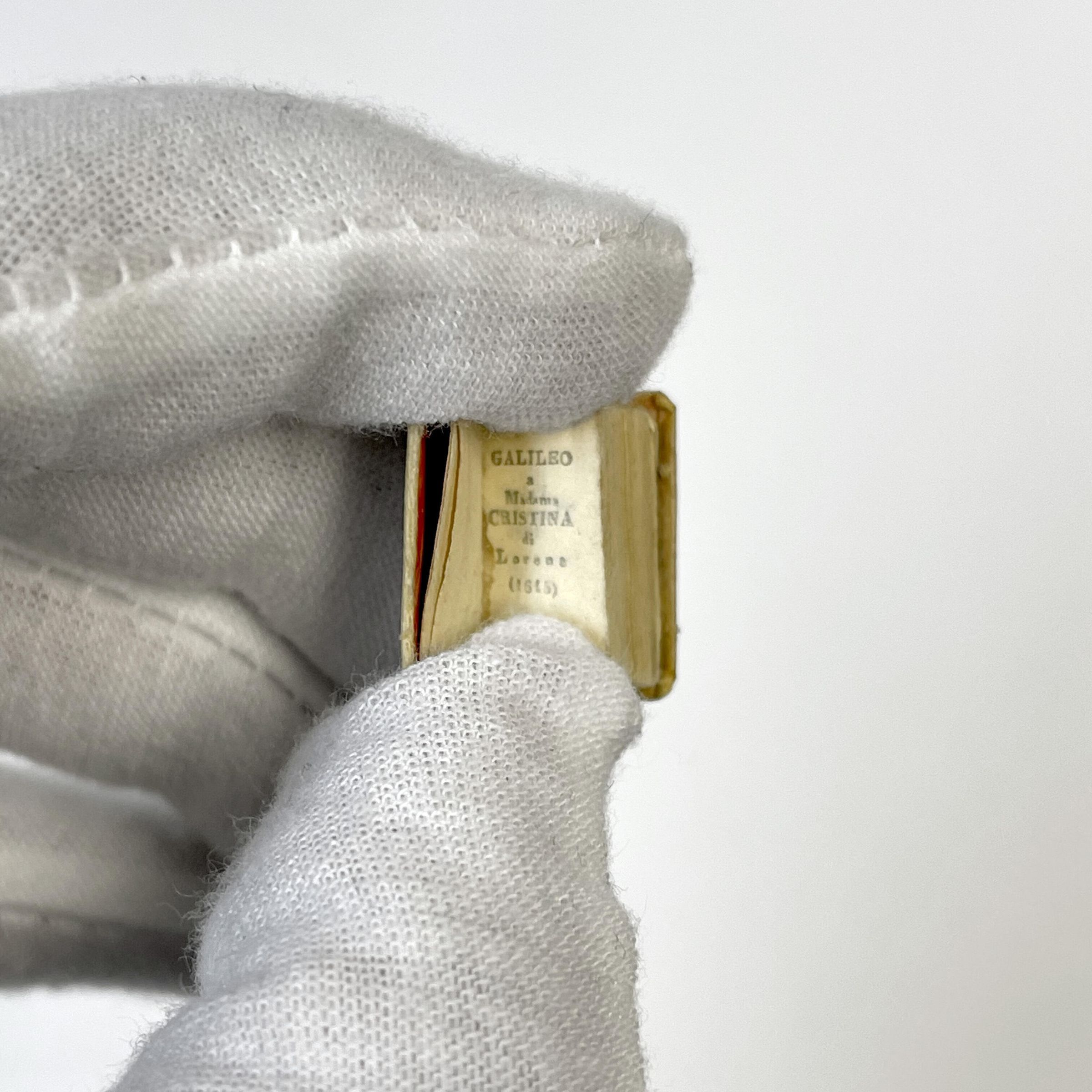 Published in Padua by the Salmin Brothers in 1896, the Galileo was until recently considered the smallest book printed from movable type, and remains one of the most renowned miniature books in existence. The text is the Novantiqua, the famous 1615 letter sent by Galileo to his friend and patron Madama di Lorenza, in which he argues for the harmony of religion and science.