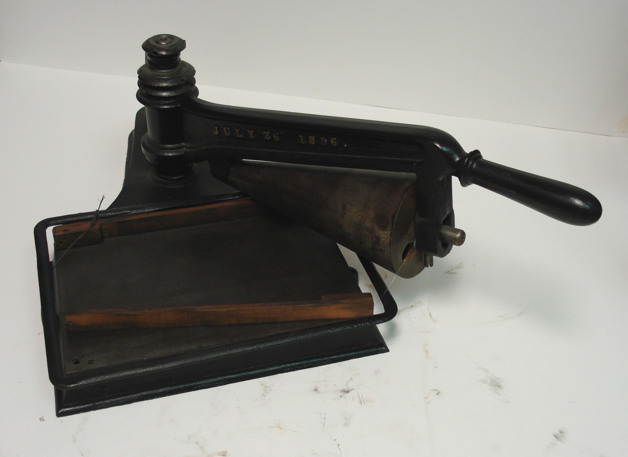 Tabletop press. Flatbed, hand-inking. Conical roller. Side 1 reads: "July 26' 1856". Side 2 reads: "S.W. Lowe's Patent".Exhibition