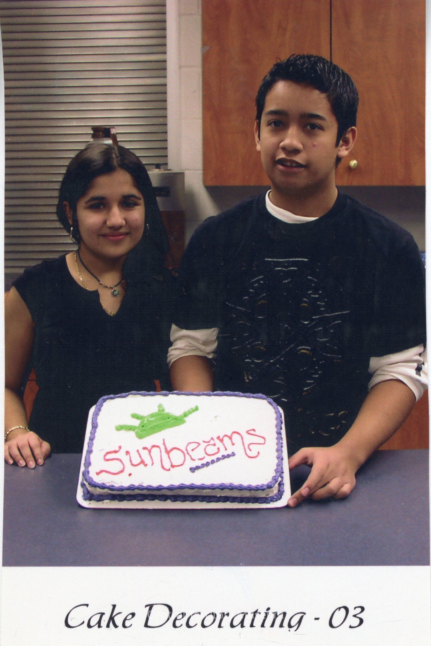 Color photo of a girl and a boy holding a decorated sheet cake during an activity at the St. Charles (Tri-City), IL Corps. The cake has a white base frosting with a purple trim around it. A green sun and the phrase Sunbeams written in pink decorate the center. The title, Cake Eating - 03, is printed in black on the lower white border.Acquisition