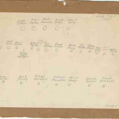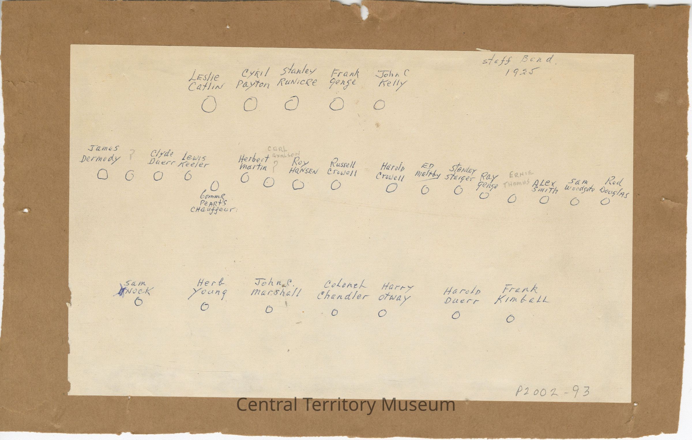 An identification chart was attached to the back of the frame housing the photo. The key is as follows: Back row: Leslie Catlin; Cyril Paton; Stanley Runicre; Frank Genge; John C. Kelly. Middle row: James Dermody; unknown; Clyde Duerr; Lewis Keeler; Commr Peart's Chauffeur; Herbert Martin; Carl Ryalson; Roy Hansen; Russell Crowell; Harold Crowell; Ed Maltby; Stanley Staiger; Ray Genge; Ernie Thomas; Alex Smith; Sam Woodgate; Red Douglas.