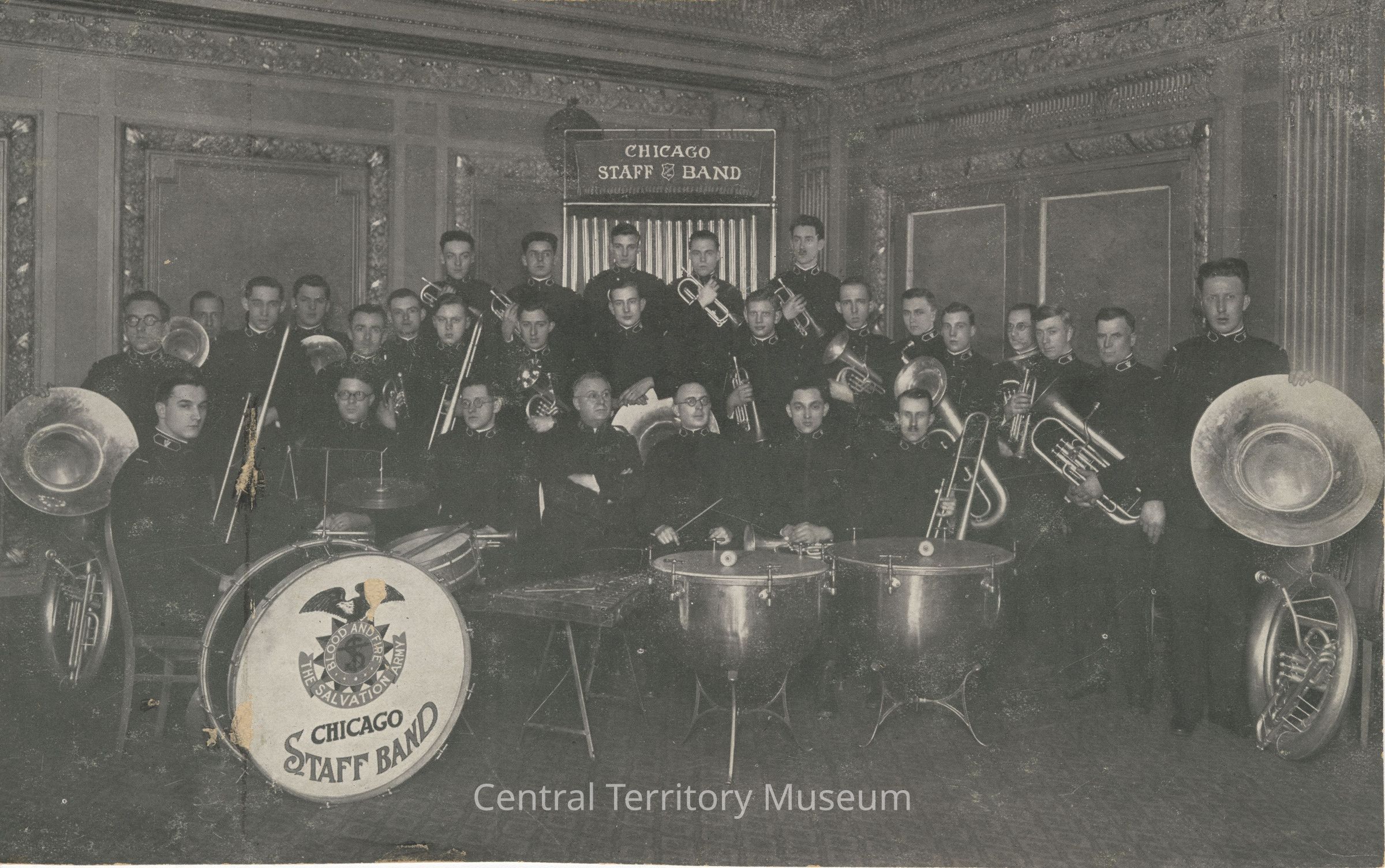 Photo of the Chicago Staff Band in 1925. The men are assembled in a room, seated and standing, with each person holding an instrument. The drums and other percussion instruments are in front of the group.