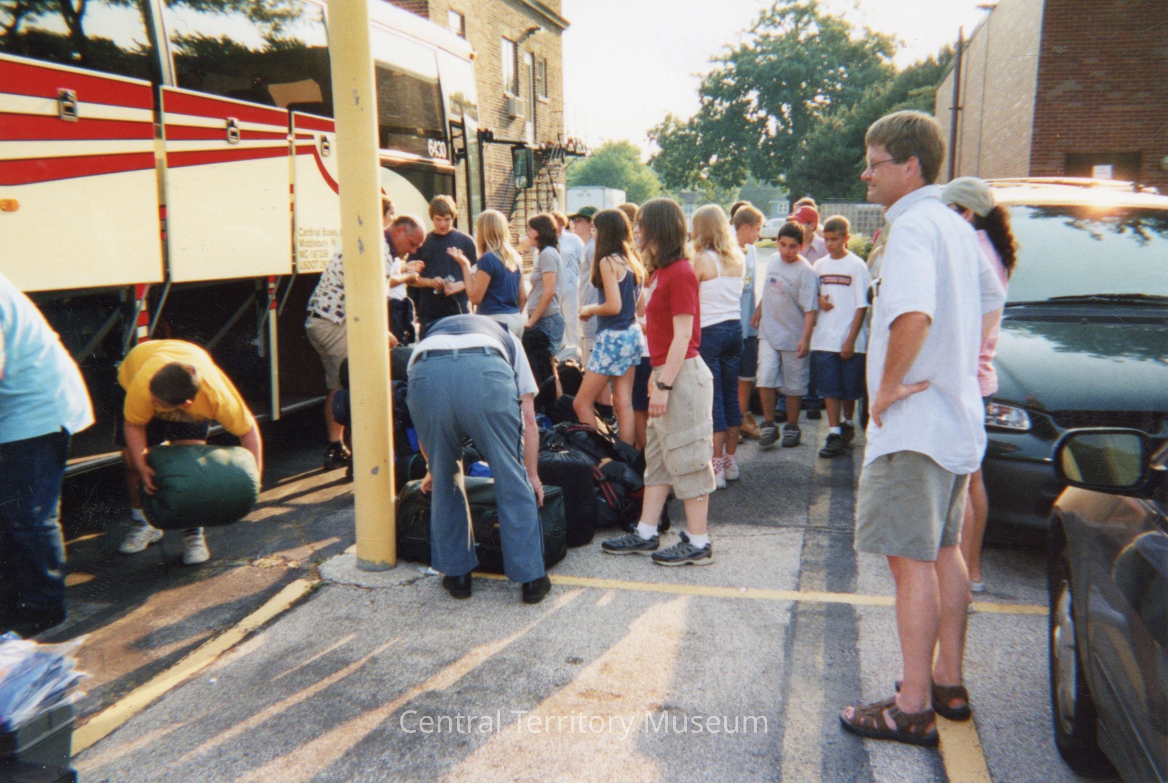 Color photo taken during a summer day camp hosted by the St. Charles (Tri-City), IL Corps. A group of adults and children are in a parking lot, with several people packing bags into the cargo area of a charter bus.