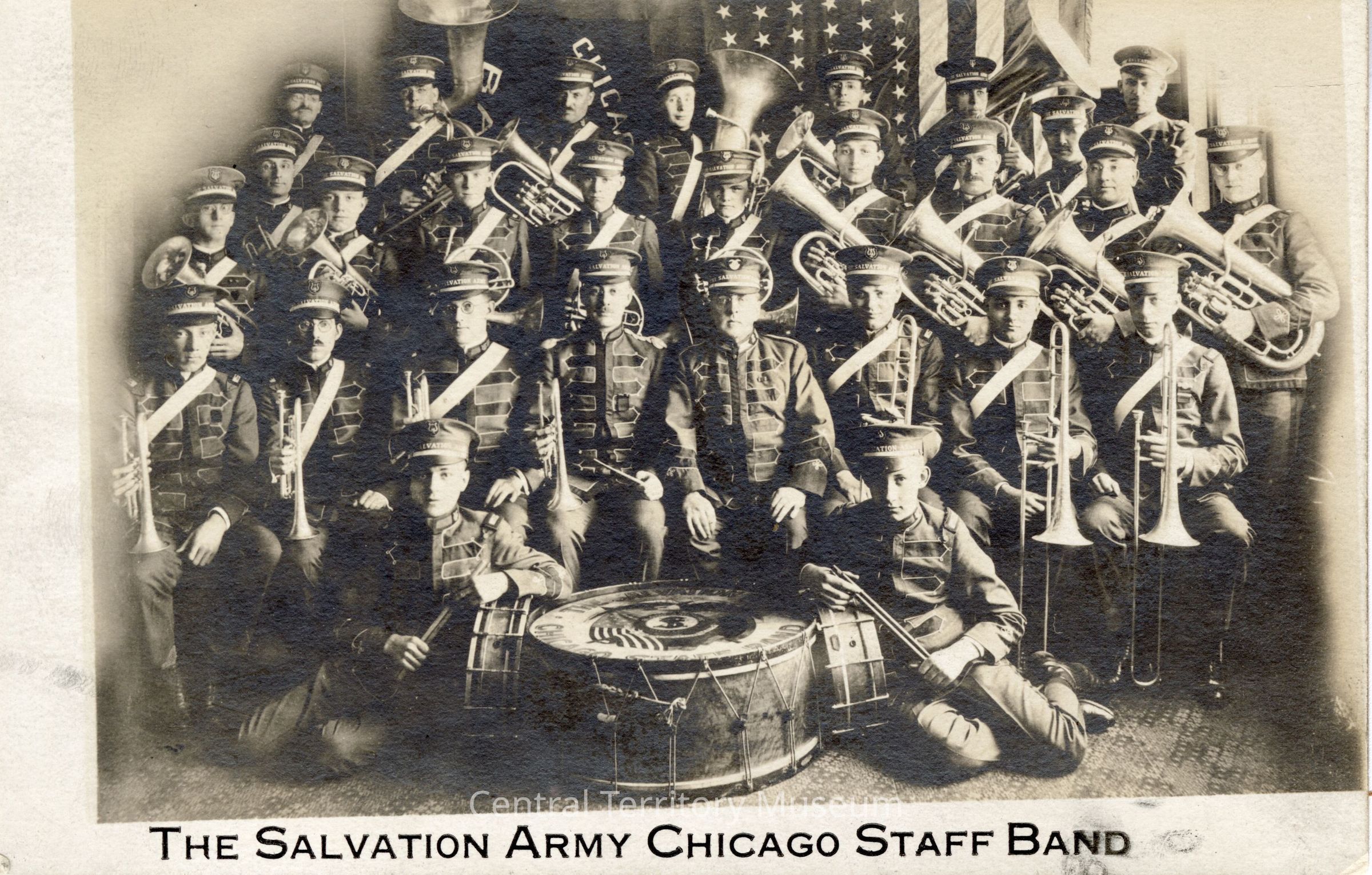 Postcard with a photo of the Chicago Staff Band in 1920. The men are arranged in three rows, seated and standing, in front of an American flag and the band flag. Each musician, wearing a band uniform, is holding their brass instrument, with the exception of two men in front. They are seated on the ground, holding drumsticks, and flanking the bass drum. Two smaller drums rest against the bigger drum. The bandmaster is seated directly behind them. The caption, The Salvation Army Chicago Staff Band, is printed in black below the photo.