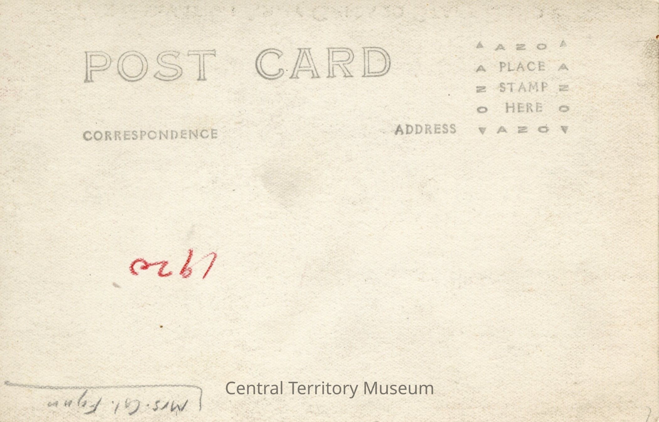 The back of the postcard has two sections, titled Correspondence (left) and Address (right) with a larger stencil font over POST CARD. The stamp box has AZO printed around the edges with upright triangles in the upper corners and downward triangles in the lower corners. The year 1920 is handwritten in red, possibly in crayon, and the name Mrs. Col. Fynn is penciled in the corner.Acquisition