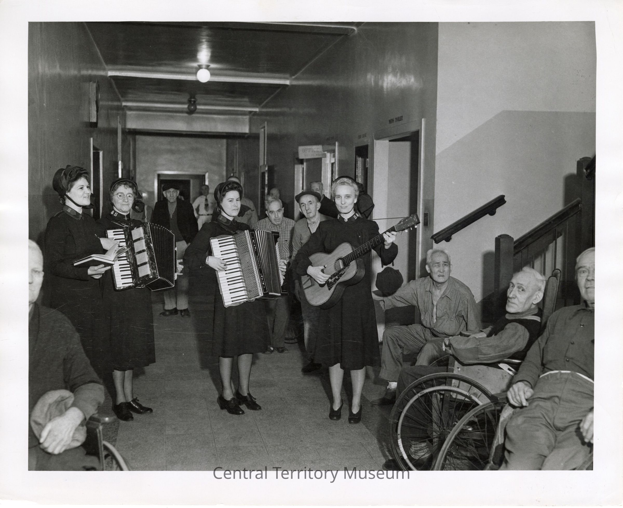 Photo of Mildred (Fox) Paton, Jean Saw, Margaret Foster, and Ellenor Thomas playing and singing for a group of older men at Hines Hospital near Maywood, Illinois. Saw and Foster are playing accordions while Thomas accompanies them on guitar. Paton, standing on the left side, is holding a songbook. The men, who are military veterans, are standing or seated in wheel chairs.Acquisition