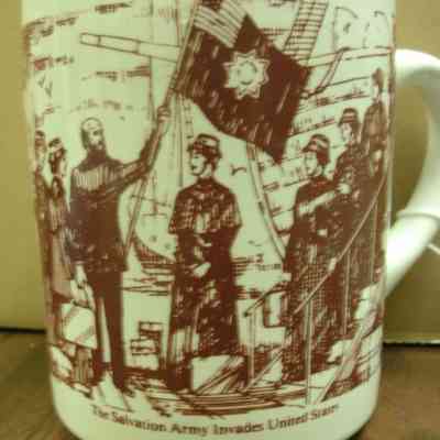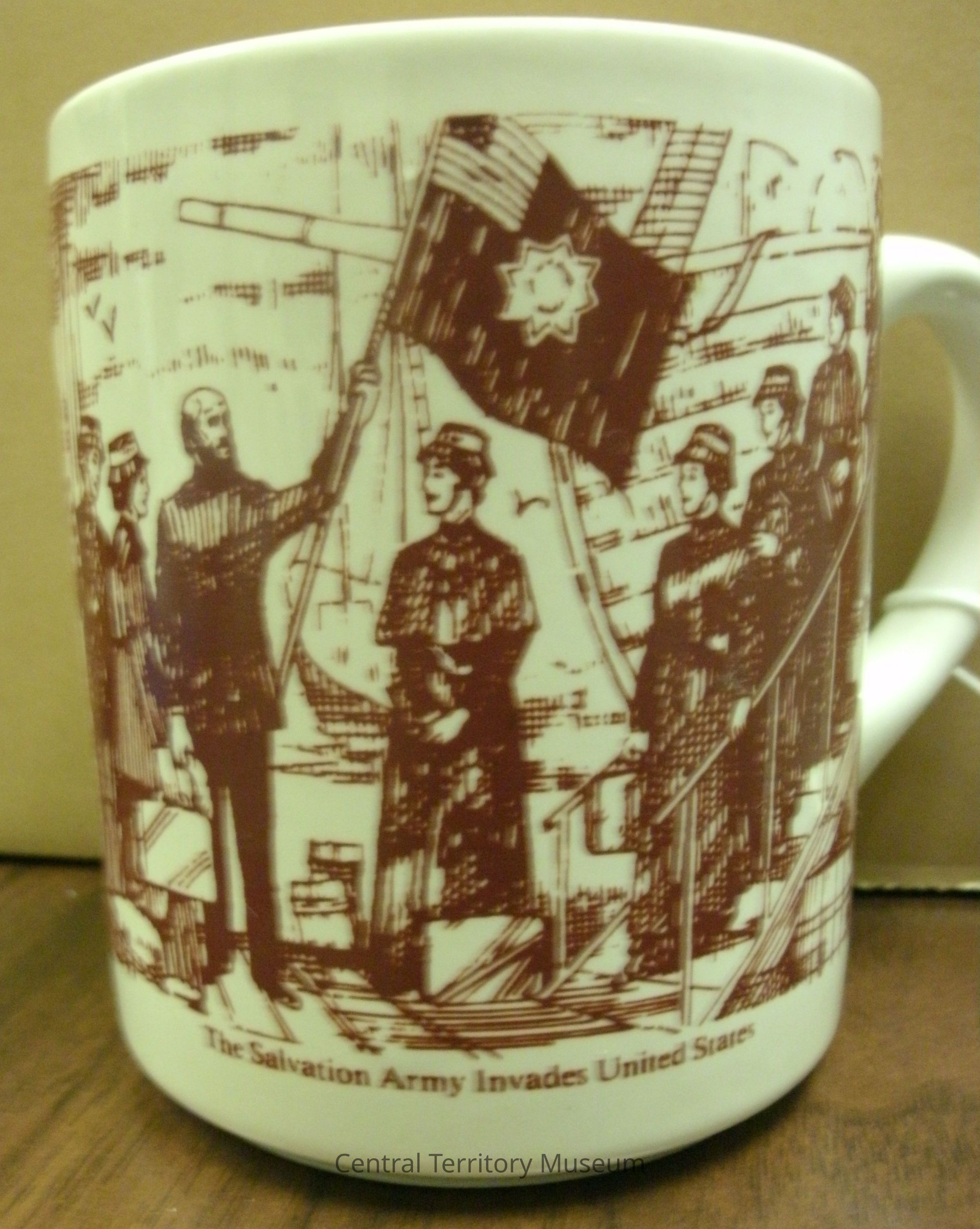 Mug, light beige ceramic, has brown printed illustration of George Railton and the Hallelujah Lassies, who were the first Salvation Army Officers (pastors) which arriving in New York, New York in the United States. The title "The Salvation Army Invades United States" is printed in brown below that.