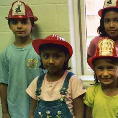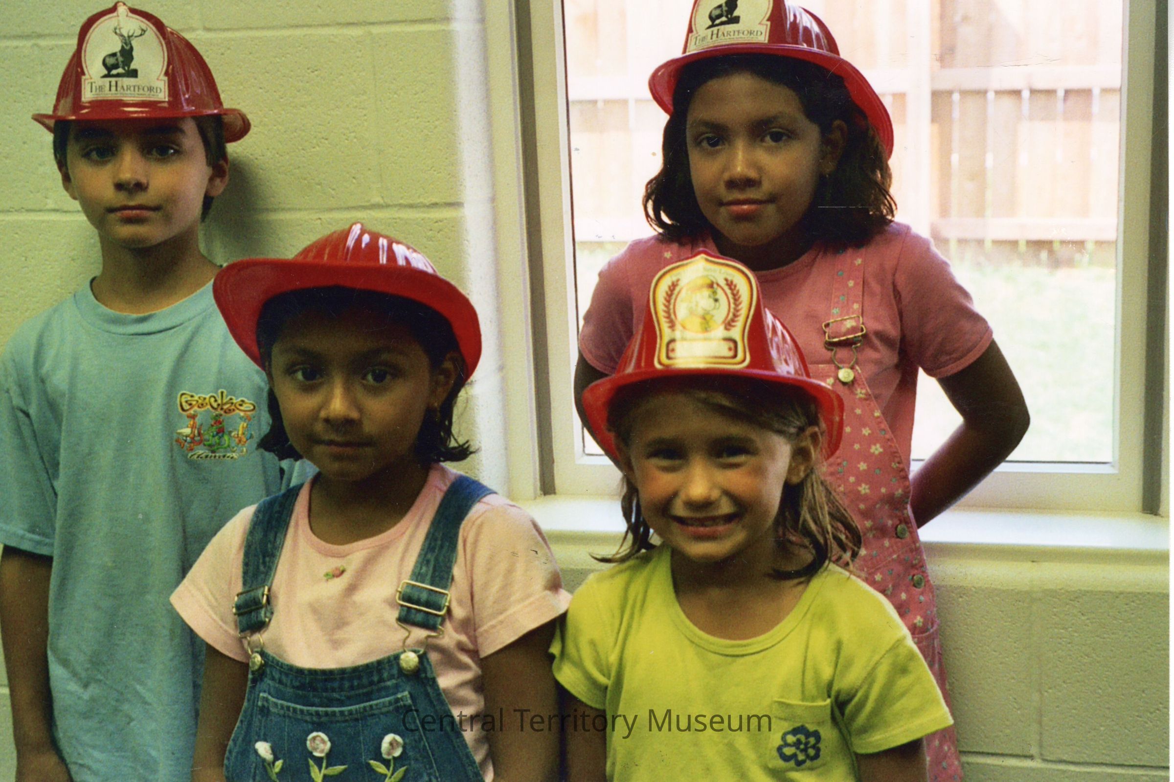 Color photo taken during a day camp hosted by the St. Charles (Tri-City), IL Corps. Four children - a boy and three girls - pose for the photographer inside a building. They are all wearing red plastic fire helmets. The boy and one girl have helmets with a logo for The Hartford with a drawing of a stag on it. One girl has a logo with a drawing of Sparky the Fire Dog.