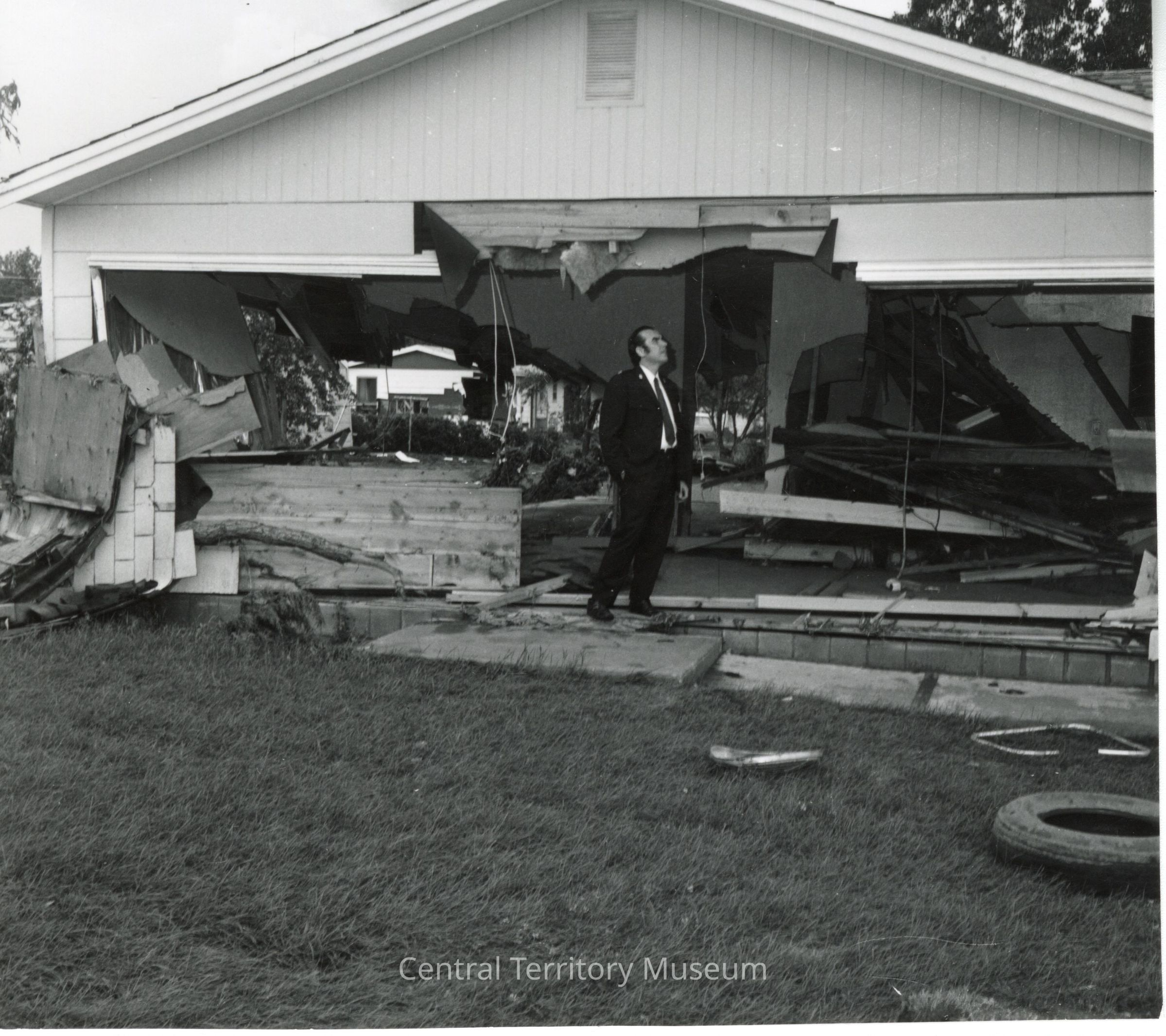 Photo of Captain Clarence Harvey surveying property damage after the Black Hills Flood in and around Rapid City, South Dakota. He is standing in front of a house that had the wall ripped away front, exposing the interior. Debris is strewn across the lawn in front.