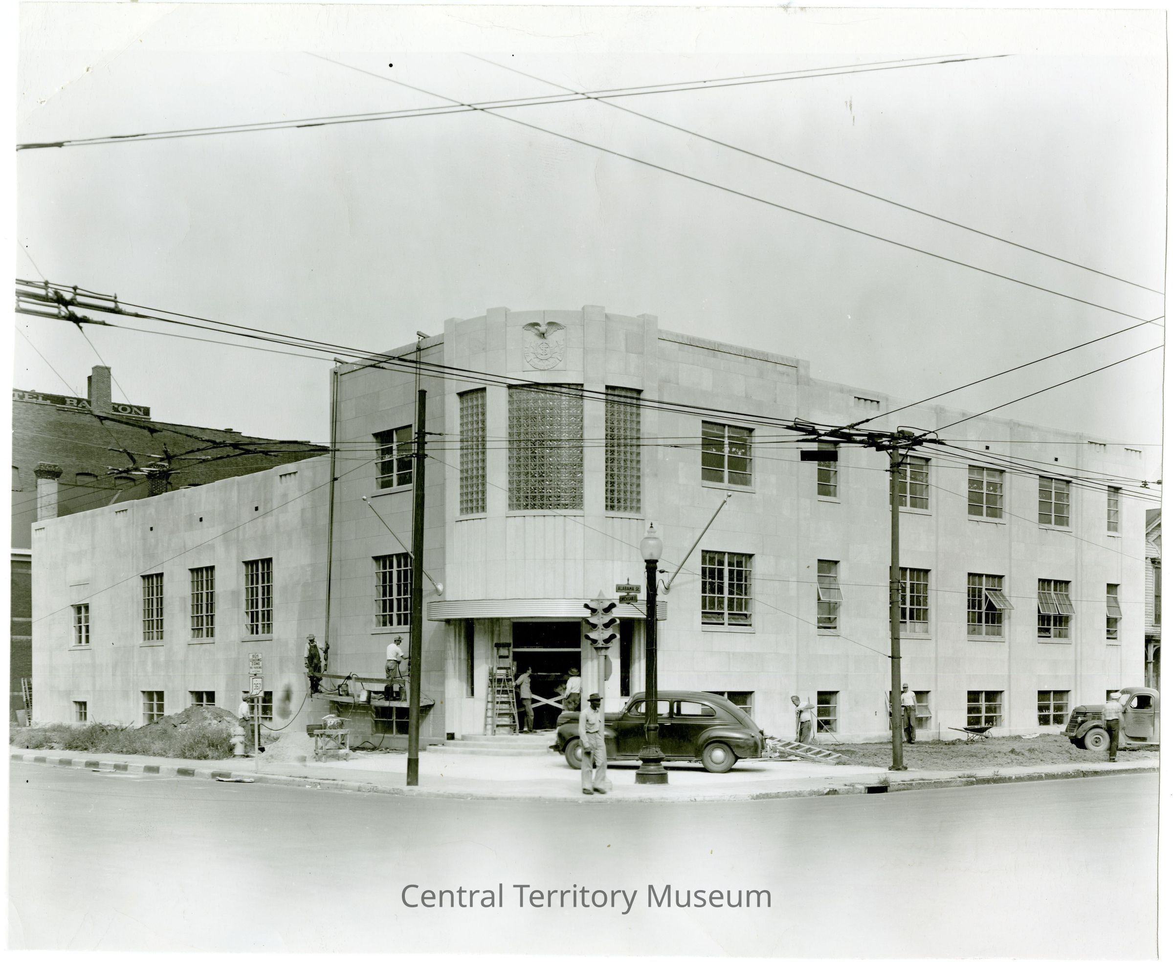 Photo of the Central City corps and Indiana Division Headquarters building, at Michigan and Alabama Streets, under construction. Men can be seen around the building, working on projects. A car and a truck are parked in front of and on the side of the building. The building is a variation on the Streamlined Moderne style, with a curved entry and strong horizontal walls to either side. Three columns, or sections, of glass block form a visual interest point over the entry doors and The Salvation Army crest can be seen just above them.Acquisition