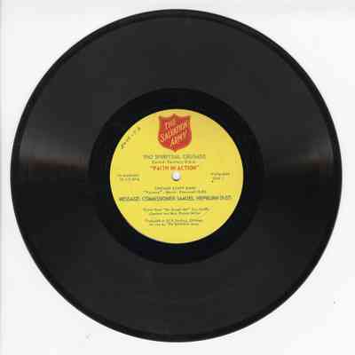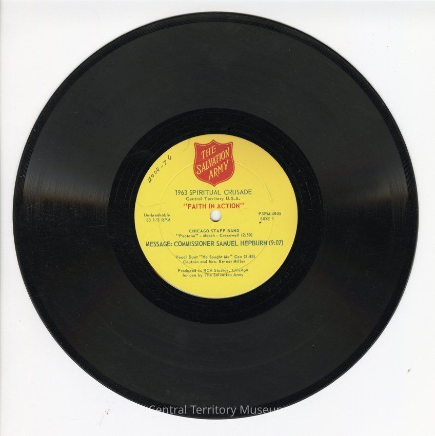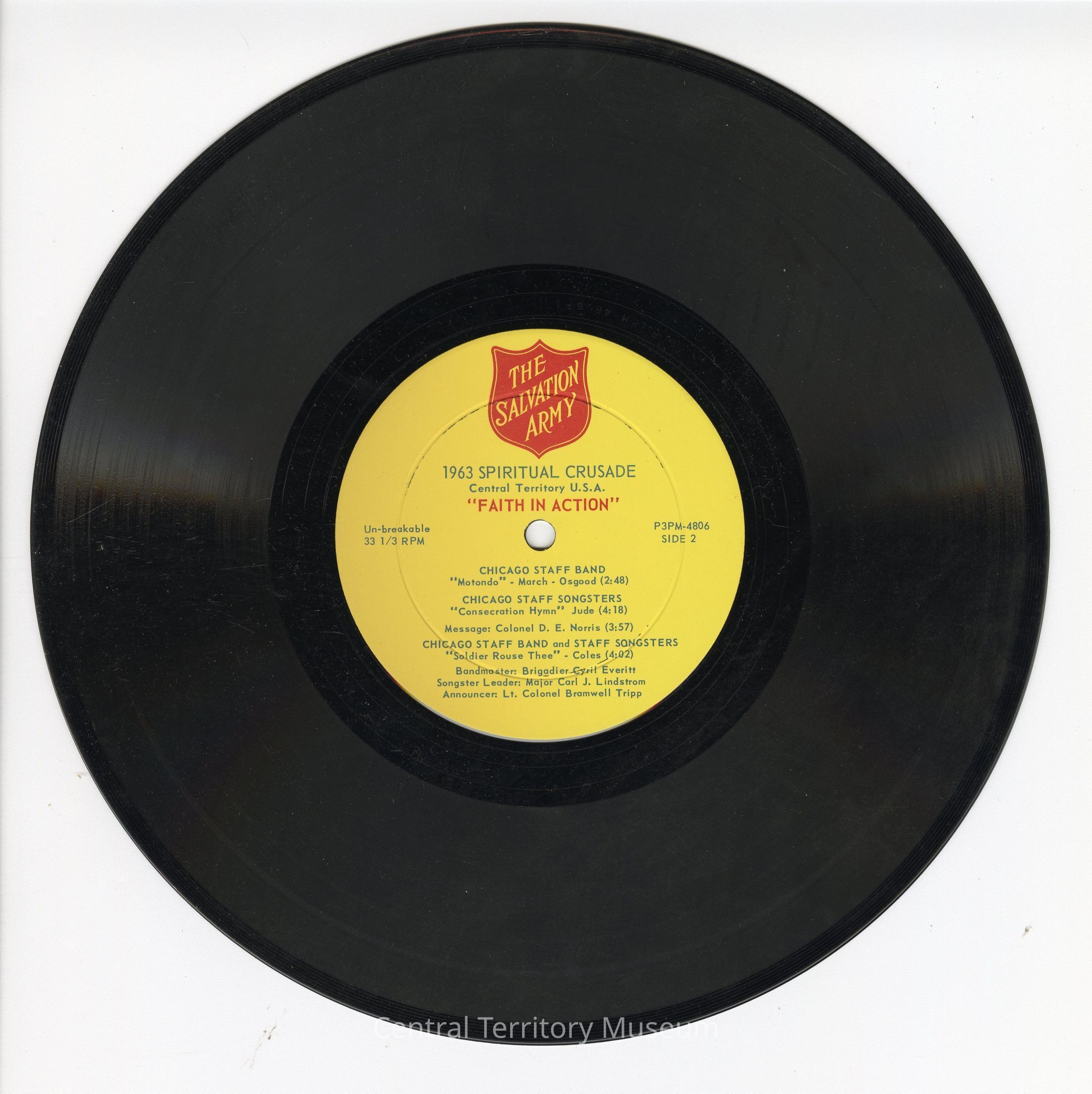 Record, 33 1/3 RPM; 1963 Spiritual Crusade, Central Territory U.S.A., "Faith in Action." Chicago Staff Band, Message by Commissioner Samuel Hepburn. Bandmaster Brigadier Cyril Everitt, Songster leader Major Carl J. Lindstrom. Featuring artists: Chicago Staff Songsters, announcer Lt. Colonel Bramwell Tripp, Captain Ernest Miller, Mary Miller.
