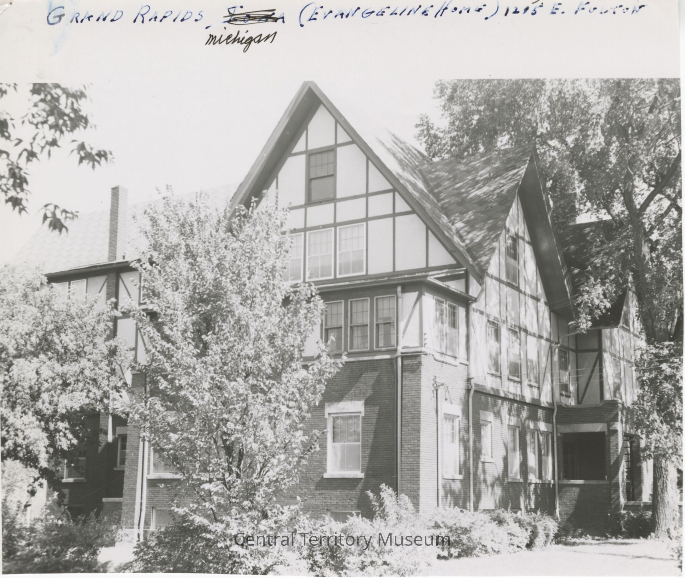 Photo of the Evangeline Home and School for Girls, 1215 E. Fulton, Grand Rapids, Michigan. The image depicts a large Tudor Revival style home in the summer. Large trees around the home are casting shadows on it. Shrubs and other landscaping line the outside of the building.Acquisition