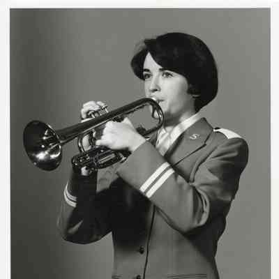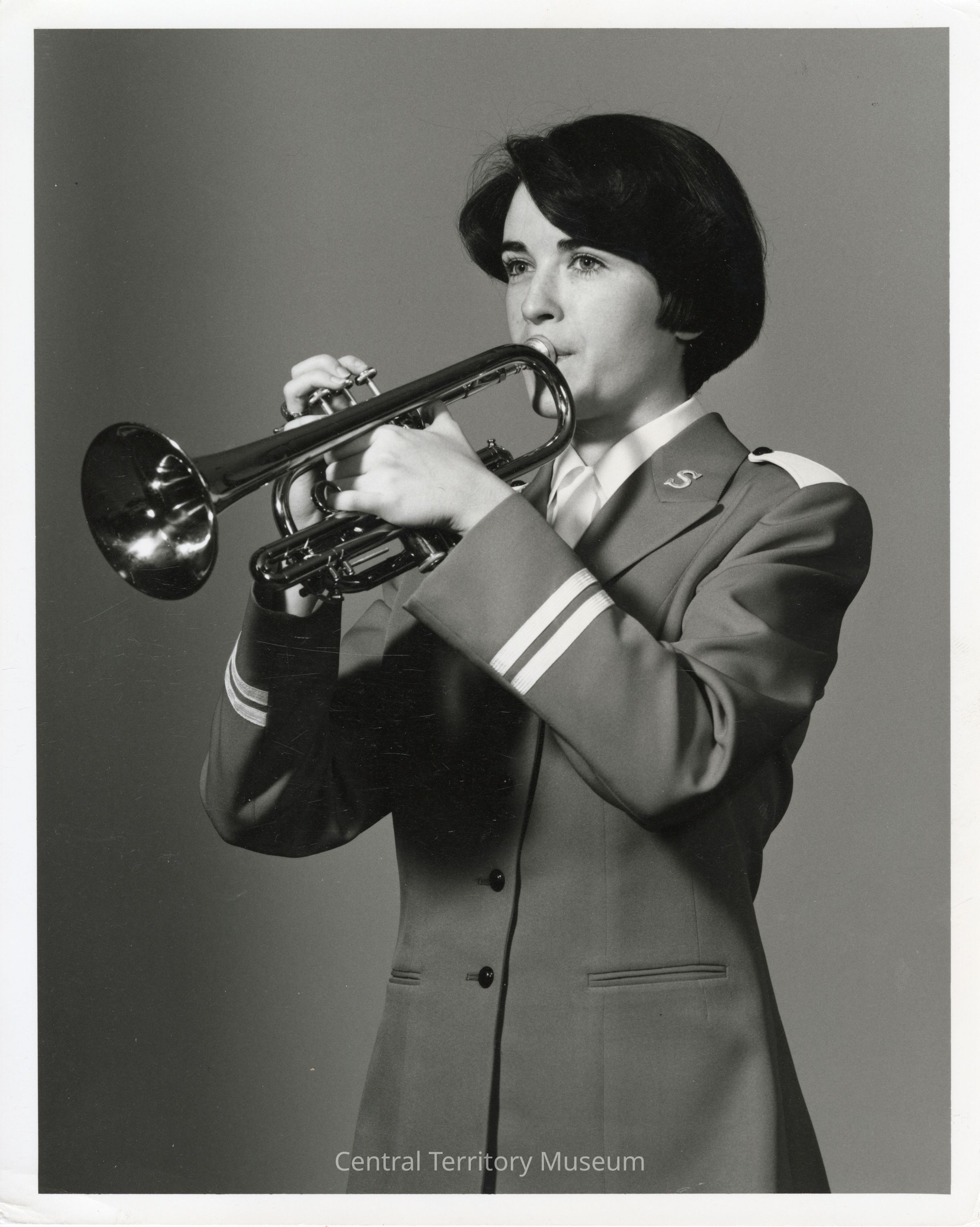 Formal photo of Peggy (Paton) Thomas, playing her cornet. She is wearing her Chicago Staff Band uniform with white stripes around the sleeve near the cuff, white shoulder tabs, and initial letter "S" on the collar. Her dark hair is styled in a bob cut.