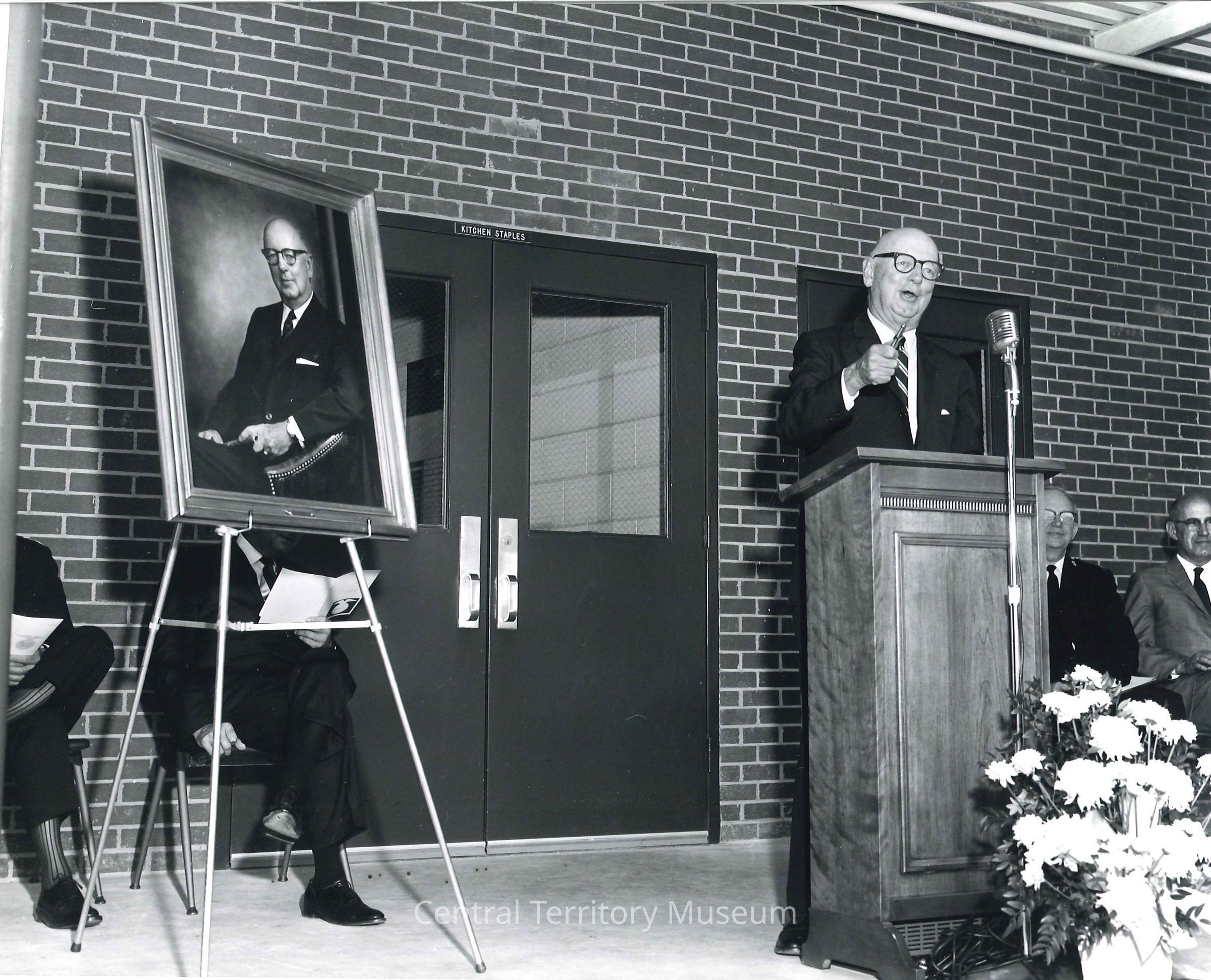 Photo taken during the dedication services for the Booth Memorial Hospital in Grand Rapids, Michigan. A typed caption on the back of the photo reads: "Words of appreciation by Mr. John Hibbard, Sr. at the unveiling of his picture. Mr. Hibbard was the chairman of the successful Home and Hospital Capital Campaign." The image depicts an older man standing behind the podium with his framed portrait on an easel to his right (photo left). To his left, Lt. Commissioner Paul J. Carlson is seated.