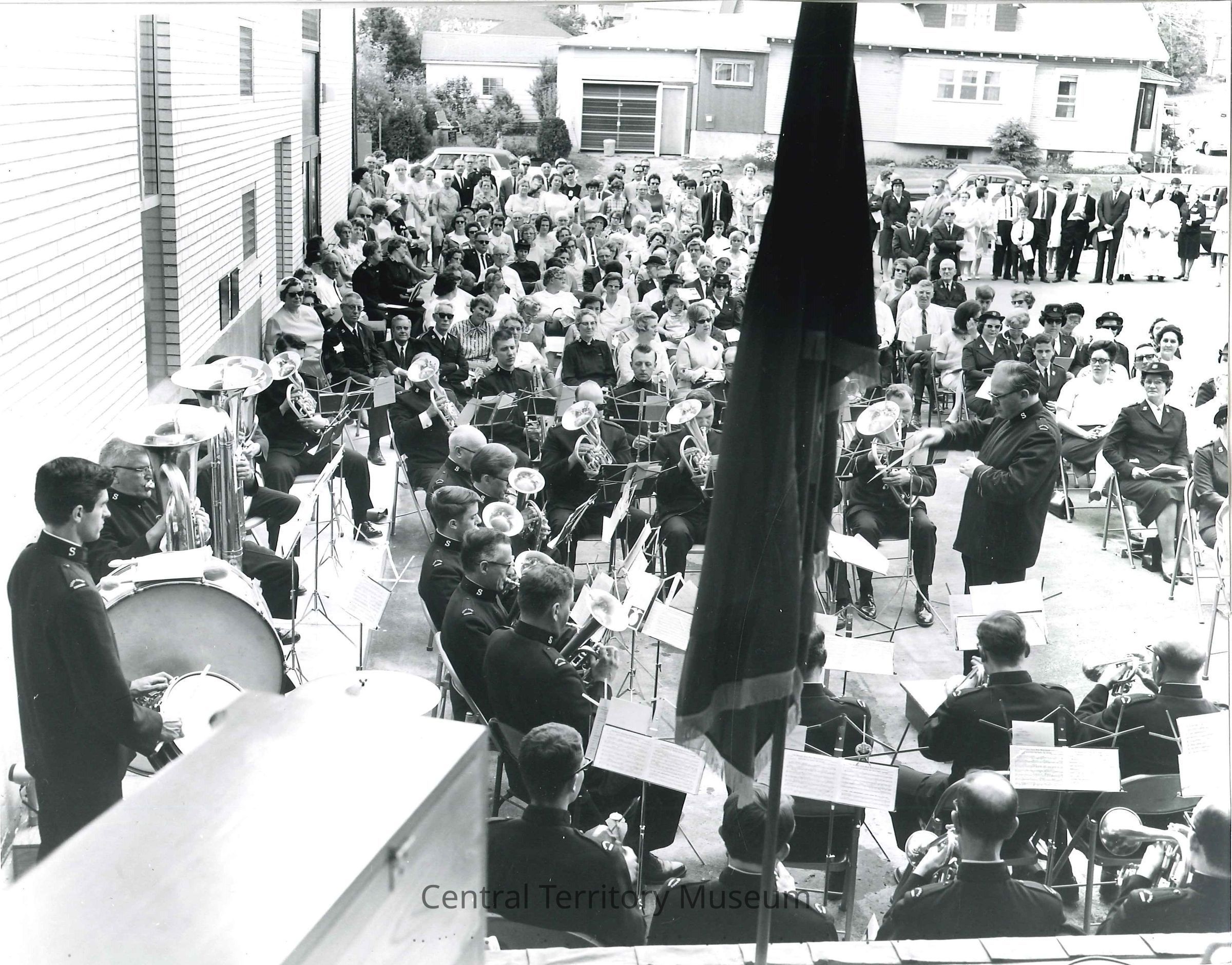 Photo taken during the dedication of the Booth Memorial Hospital in Grand Rapids, Michigan. A typed caption on the back of the photo reads: "Chicago Staff Band and part of the audience attending the dedication ceremonies." The photographer is looking down at the band in the foreground and across to the audience.