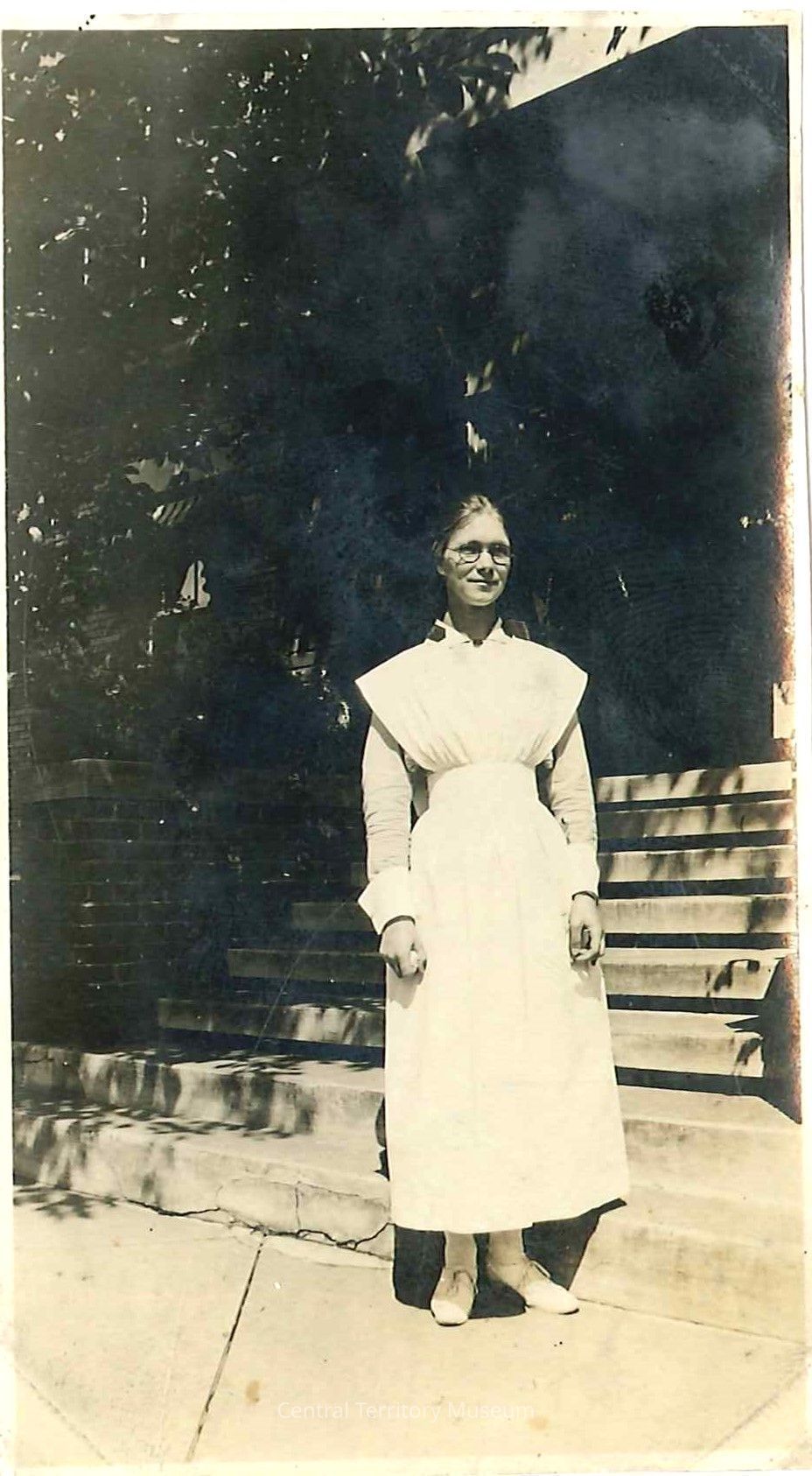 Photo of Ebba Christofferson standing in front of the stairs at the Grand Rapids, Michigan Home and Hospital. She is wearing a white apron, which covers her bodice, shoulders, back and lower body, over her uniform dress.Acquisition