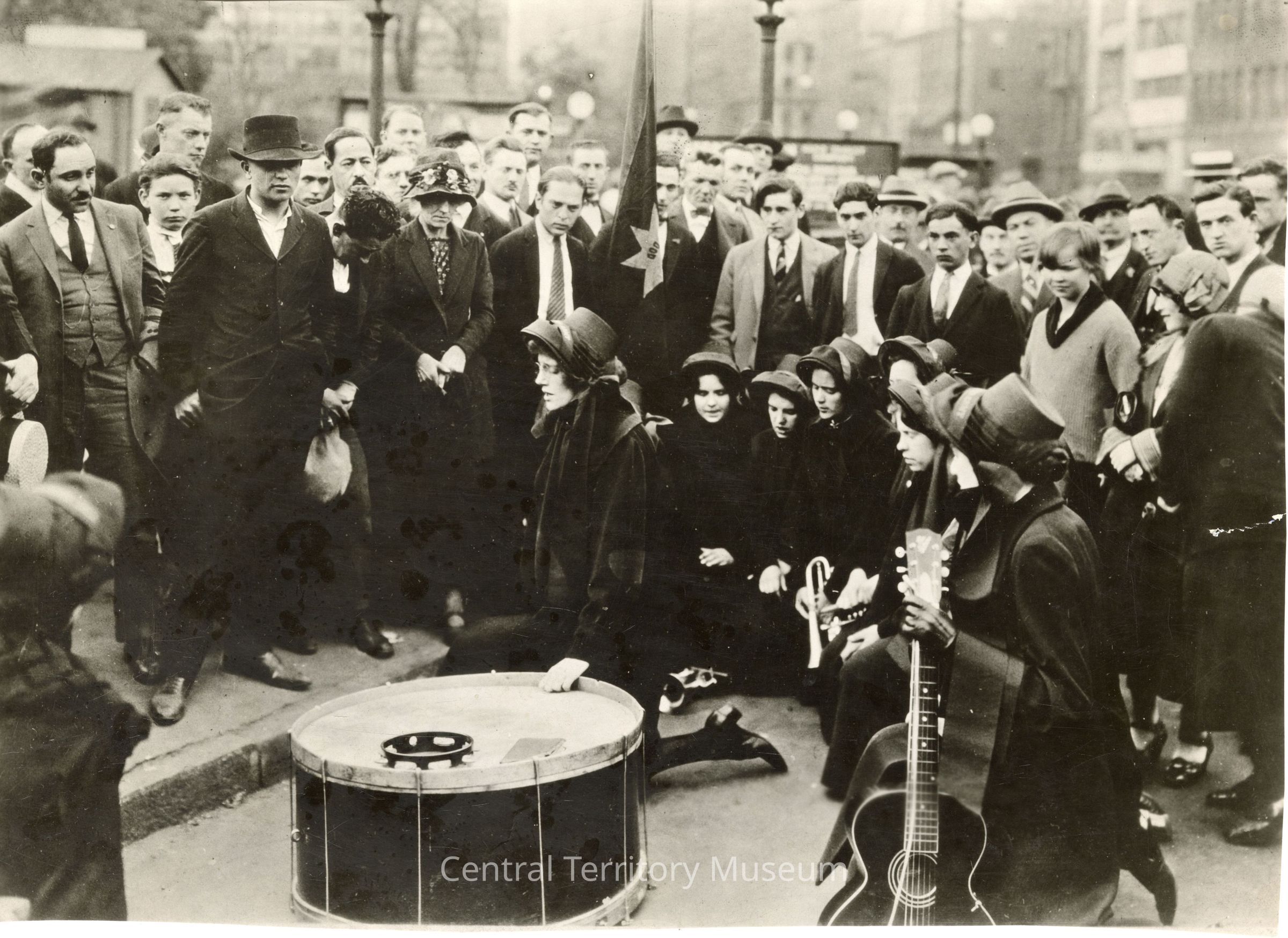 Photo taken during an open air in Chicago, Illinois. A crowd of men, women, and children encircle a group of women Salvationists. One woman is kneeling by the bass drum, lying on its side in the center. An upside down tambourine is resting on the drumhead. The other women are kneeling behind here and several of them are holding brass horns and a guitar. A Salvation Army flag can be seen behind the woman at the drum. In the far background, tall buildings line the street.