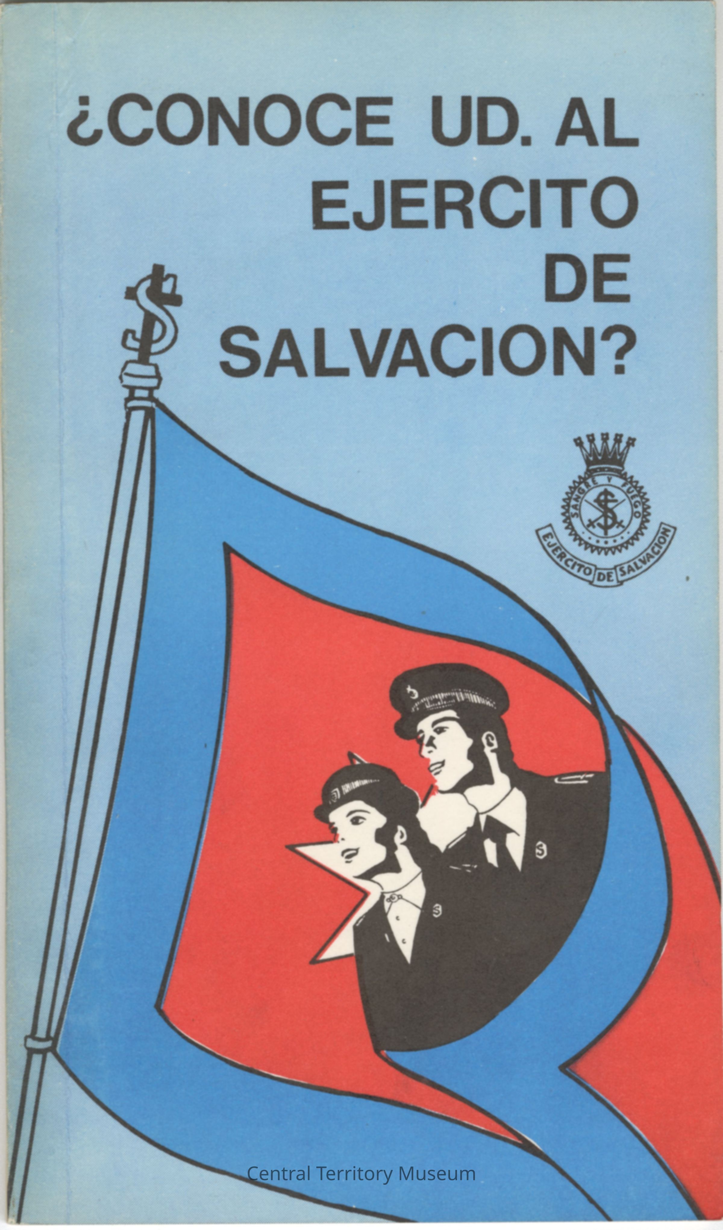 Physical Description: Paper back book with a blue cover and black lettering. The cover has an illustration of a Blood and Fire flag and flag pole with an "S" wrapped around a cross. There are also two Salvation Army Officers printed on the flag. Above the flag is the Blood and Fire crest written in Spanish saying, "Sangre y Fuego, Ejercito de Salvacion." 4.5 in x 7 in x .25 inAcquisition