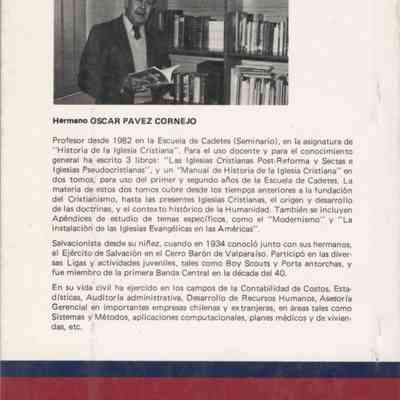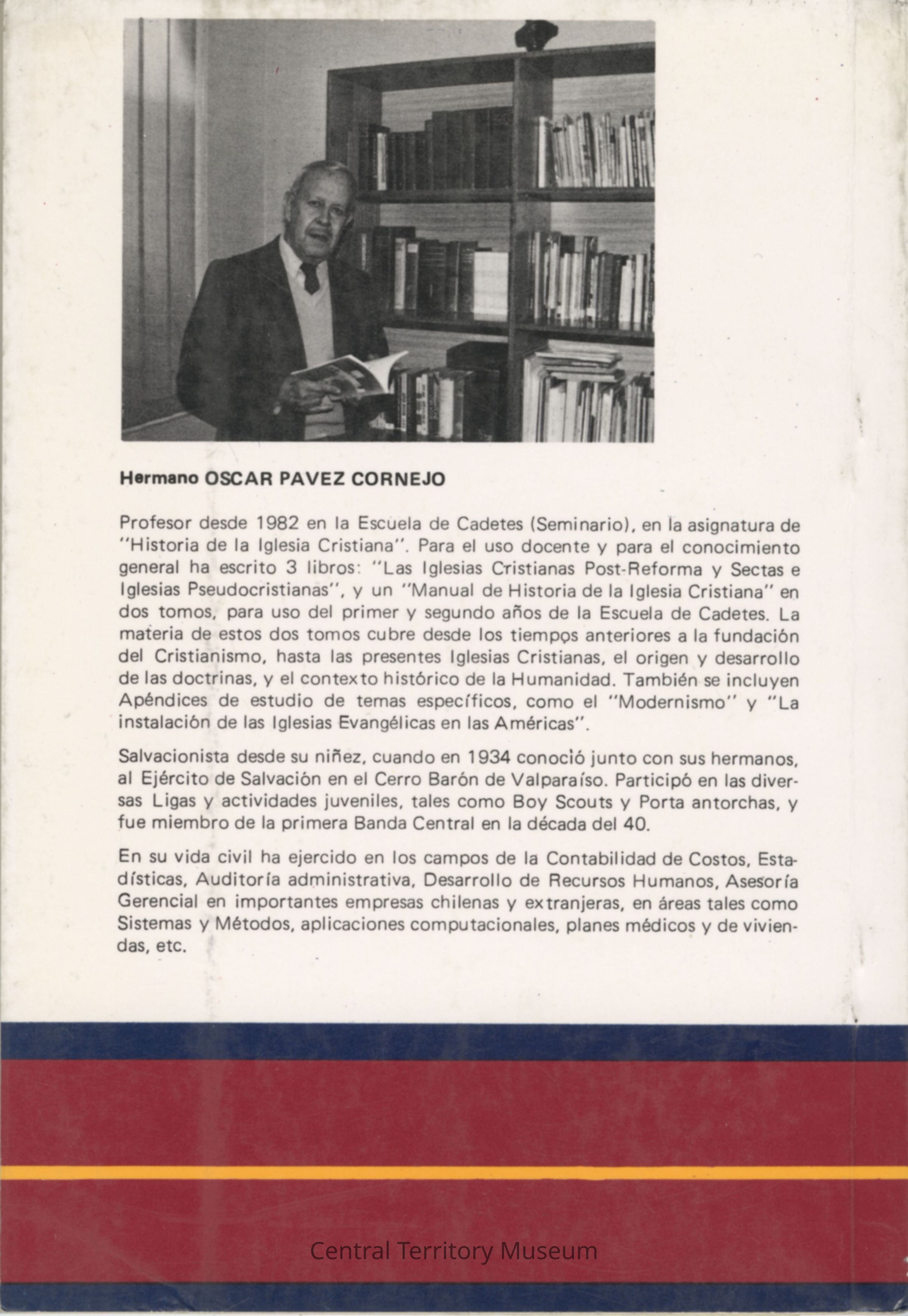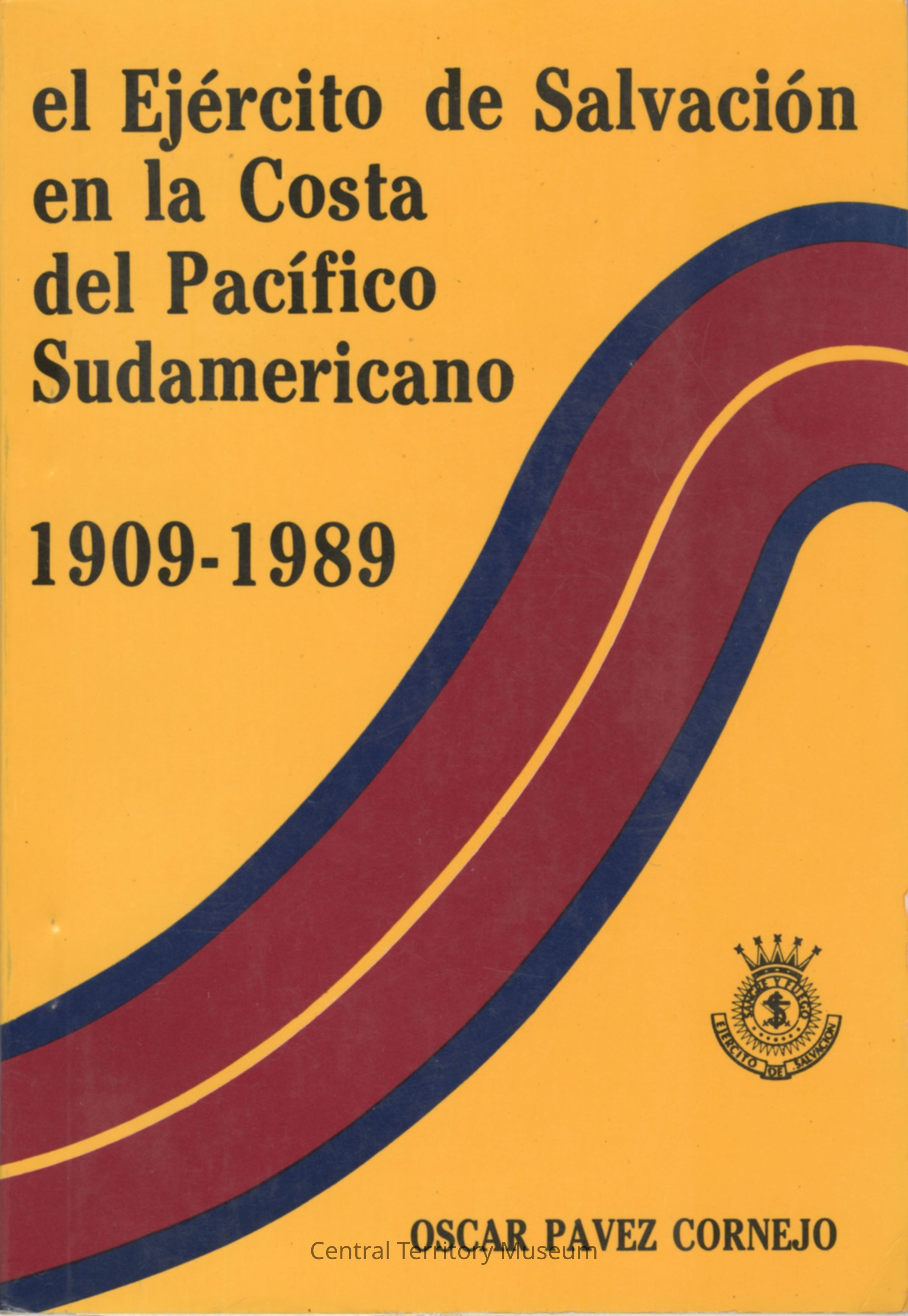 Paper back book with a yellow cover and the Salvation Army colors as a winding road. The lettering is black with a Blood and Fire crest. The back is white with a photograph of the author and the same road with the Salvation Army colors. The title of the book is, "El Ejército de Salvación en la Costa del Pacífico Sudamericano 1909-1989" which translates to, "The Salvation Army on the South American Pacific Coast 1909-1989." The author is Oscar Pavez Cornejo who was a professor at the School of Cadets (Seminary) in the subject of, 'History of the Christian Church.' This book details the South America West Territorial history from 1909 to 1989 which includes the countries of Chile, Bolivia, Perú, and Ecuador. The book was published by the Salvation Army for the Territorial Headquarters at Avenida España 46, Santiago, Chile. This book was collected by Lt. Colonels David and Darlene Harvey when they served in Santiago, Chile from 2001 to 2003.