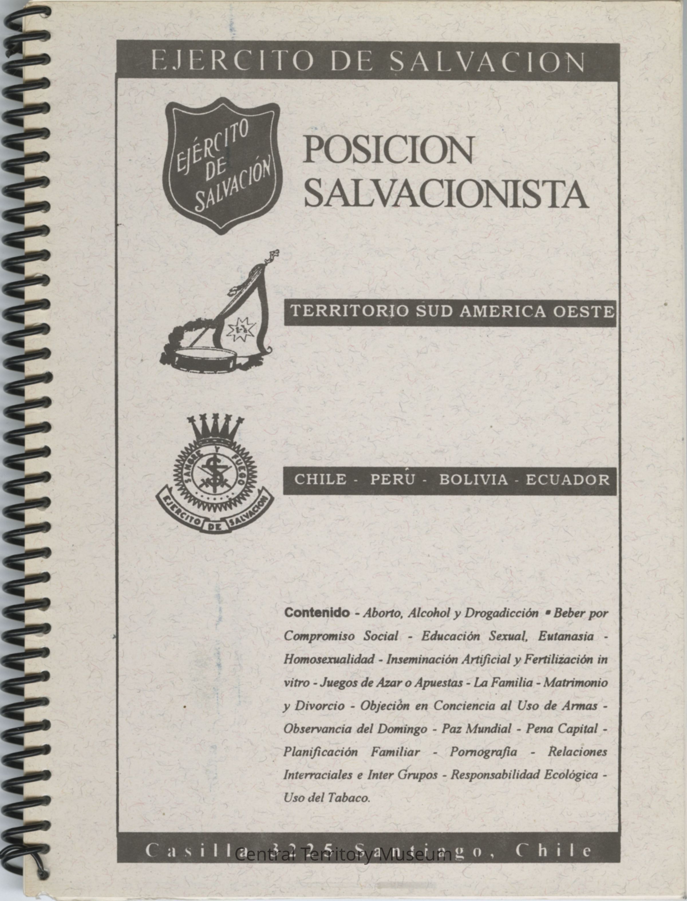 Spiral bound paper back book with black print and illustrations. The cover's black and white illustrations include a Red Shield logo, Blood and Fire flag, and Blood and Fire crest all in the Spanish language. The title of the book is, "Posicion Salvationista: Territorio Sud America Oeste." The title translates to, "Salvationists Position: South America West Territory." The South America West Territory includes Chile, Perú, Bolivia, and Ecuador with the Territorial Headquarters in Santiago, Chile. The booklet is broken up into 22 topics that are important to The Salvation Army and that they have a stance on. Some of the positions include: alcohol, sex education, family, marriage, divorce, homosexuality, etc. The book was accumulated by Lt Colonels David and Darlene Harvey when serving in Santiago, Chile from 2001 to 2003. This booklet is 22 pages written all in Spanish.