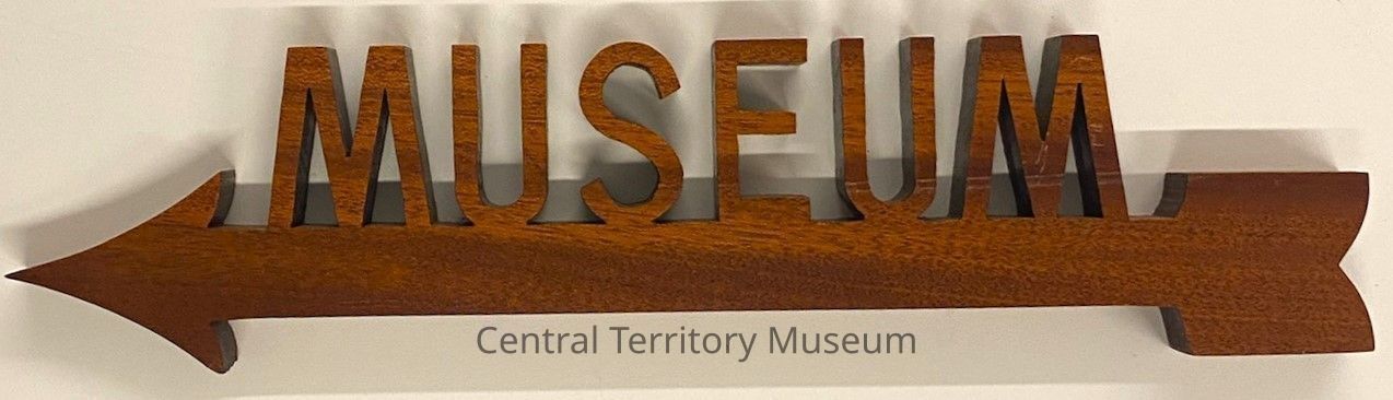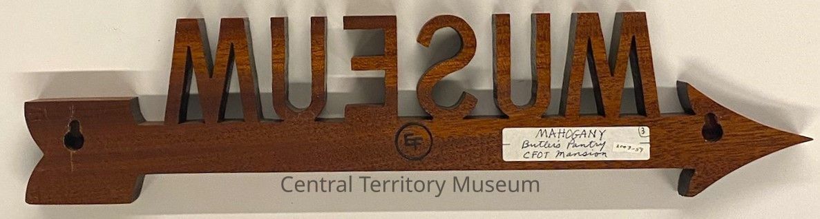 The sign was used at the Central Territory Headquarters in Des Plaines, IL "A" building to direct people toward the museum in the "C" building. Each sign was made by the donor and each is stamped on the back with his initials EF.