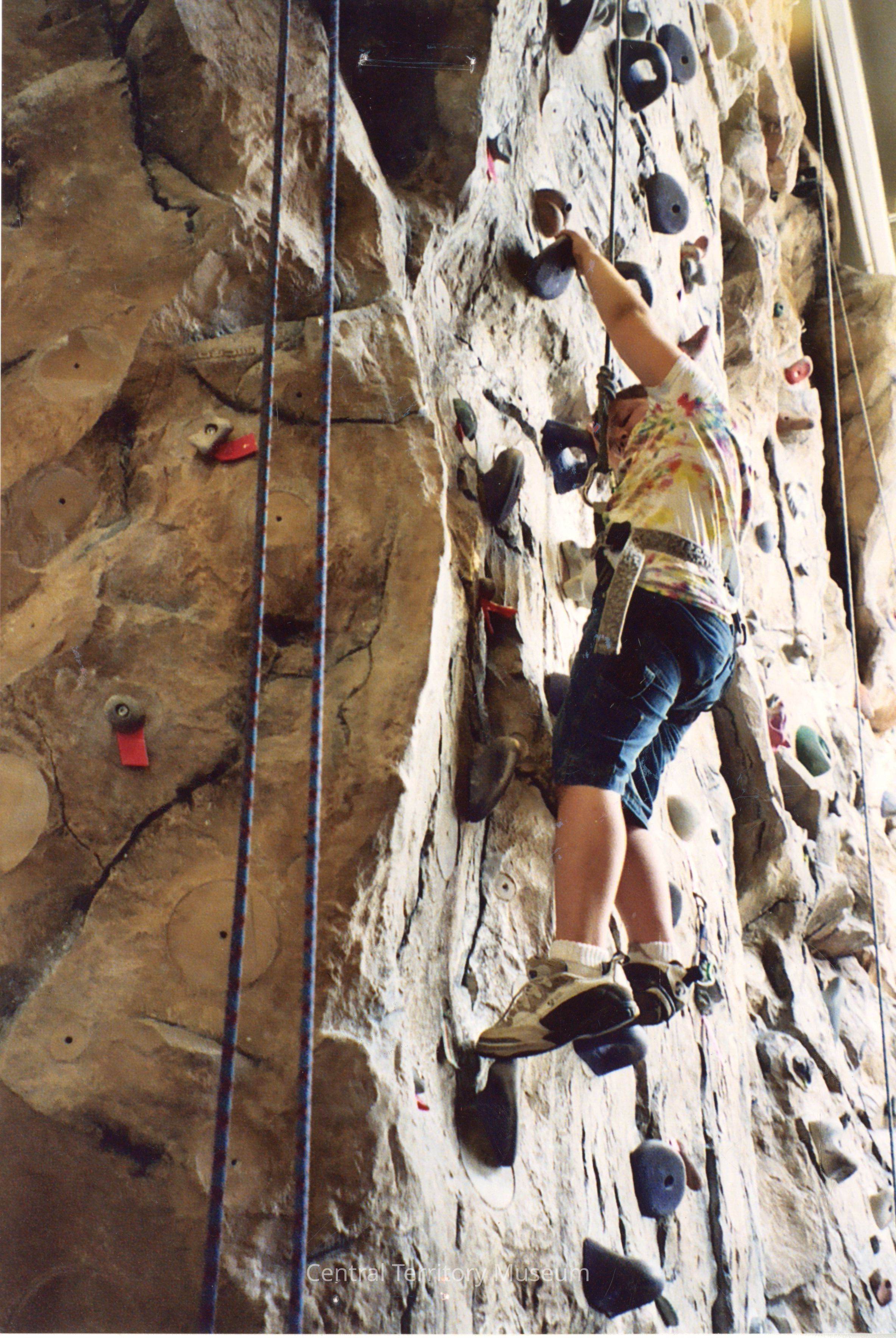Color photo taken during a day camp hosted by the St. Charles (Tri-City), IL Corps. The photographer is looking slightly upward toward a child climbing an indoor rock climbing wall.