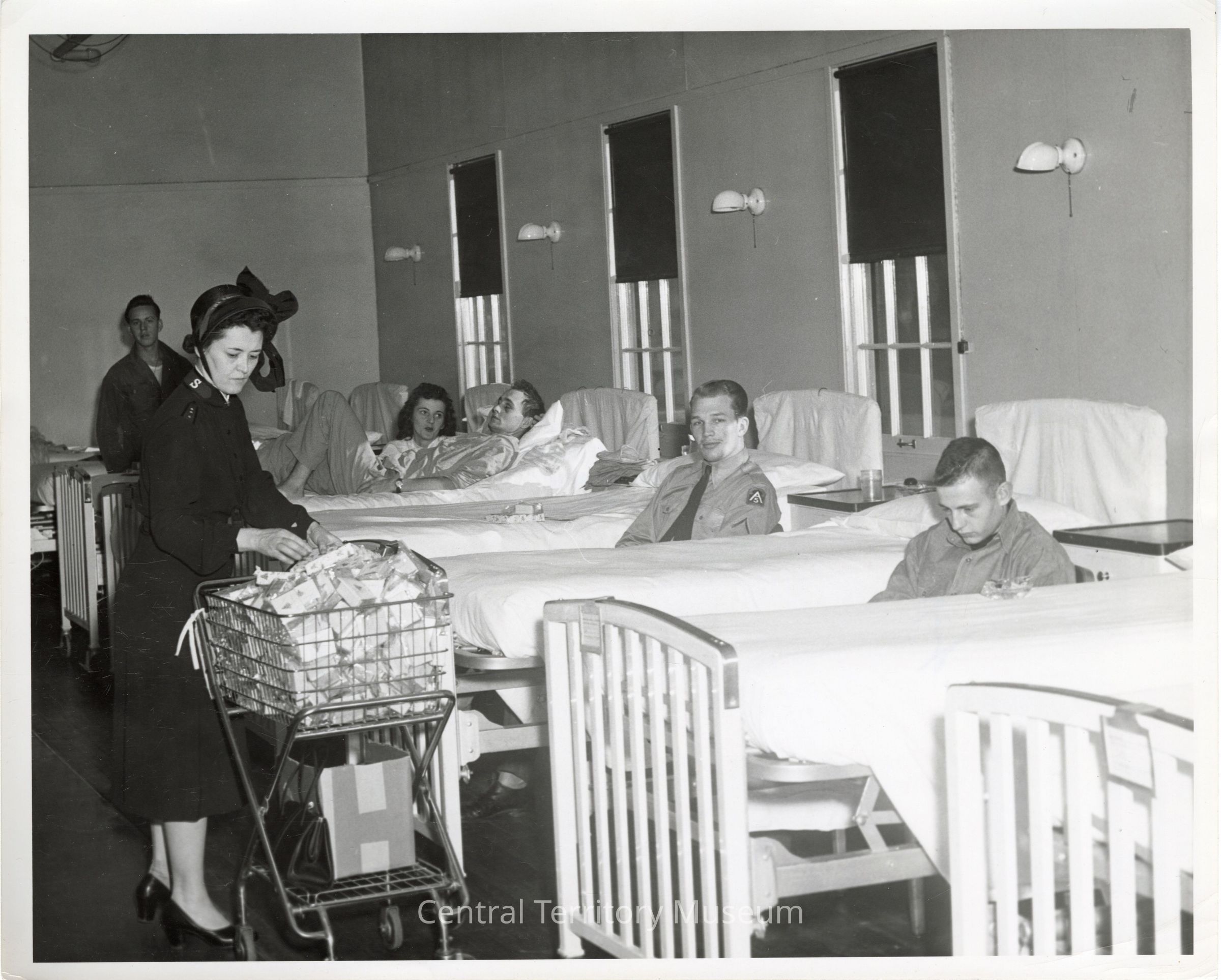 Photo of a female Salvation Army officer delivering packages to male patients at the Great Lakes Naval Hospital. She is standing next to a metal cart, similar to a shopping cart, filled with wrapped Christmas presents in the basket. Her purse and a cardboard box are on the shelf underneath. Four men can be seen in the room. One is standing against the wall in the background, another is lying in bed and has a woman sitting next to him, and the other two men are seated next to hospital beds.