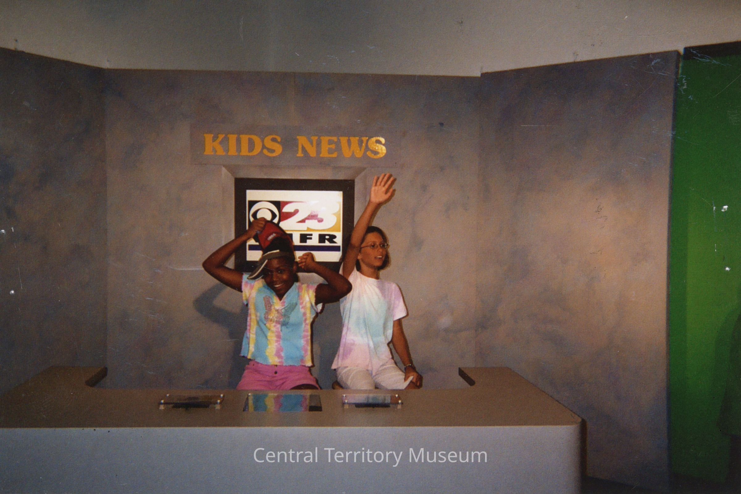 Color photo taken during a day camp hosted by the St. Charles (Tri-City), IL Corps. A Black girl and a White girl sit behind a desk, waving at someone. The wall behind them has a large phrase "Kids News" and a station logo under that.