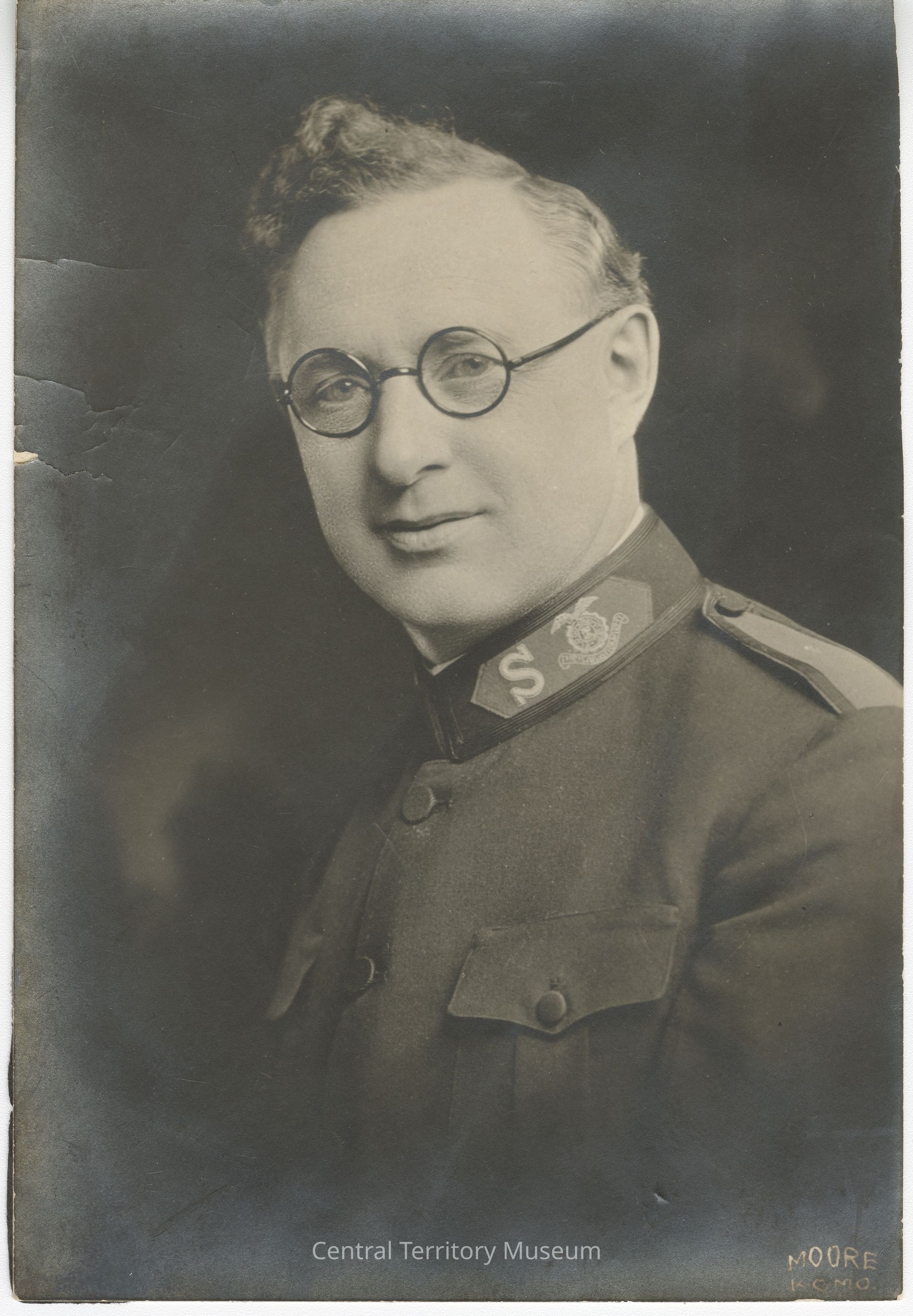 Black and white studio photograph, in a 1/4 headshot pose, of Kristian Fristrup. He is facing the camera but his shoulders are facing left. He is wearing his Salvation Army uniform but no cap and has round eyeglasses.