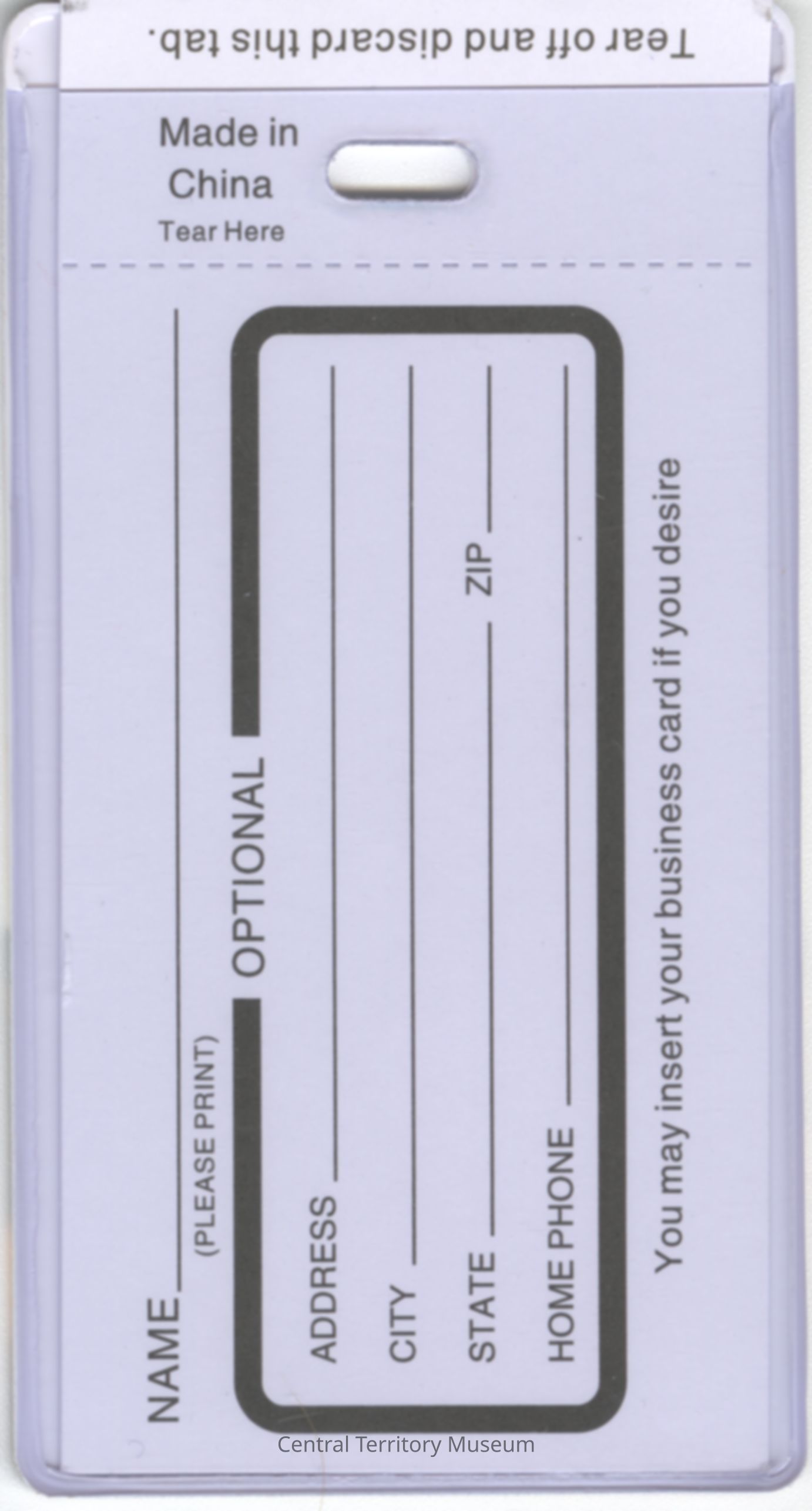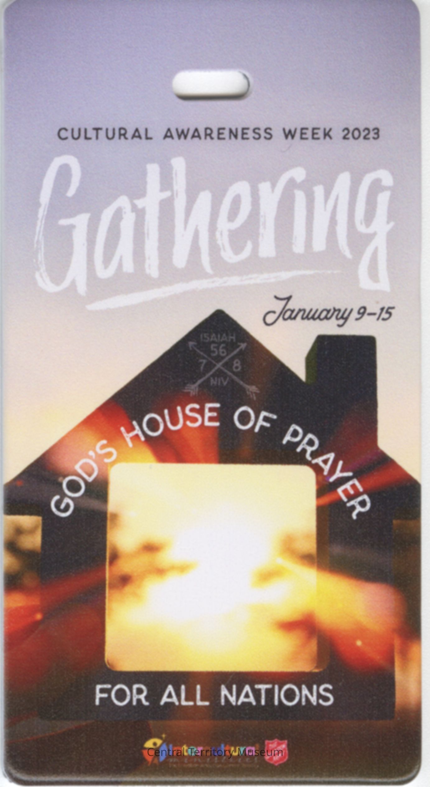 Plastic luggage tag with a graphic of a house and rising sun. The luggage tag was made by the Intercultural Ministries Department at THQ. The Intercultural Ministries Department logo is on the bottom of the luggage tag and above is a house that reads, "God's House of Prayer For All Nations." This tage is titled, "Gathering" and it is for the Cultural Awareness Week in 2023 from January 9th to 15th.