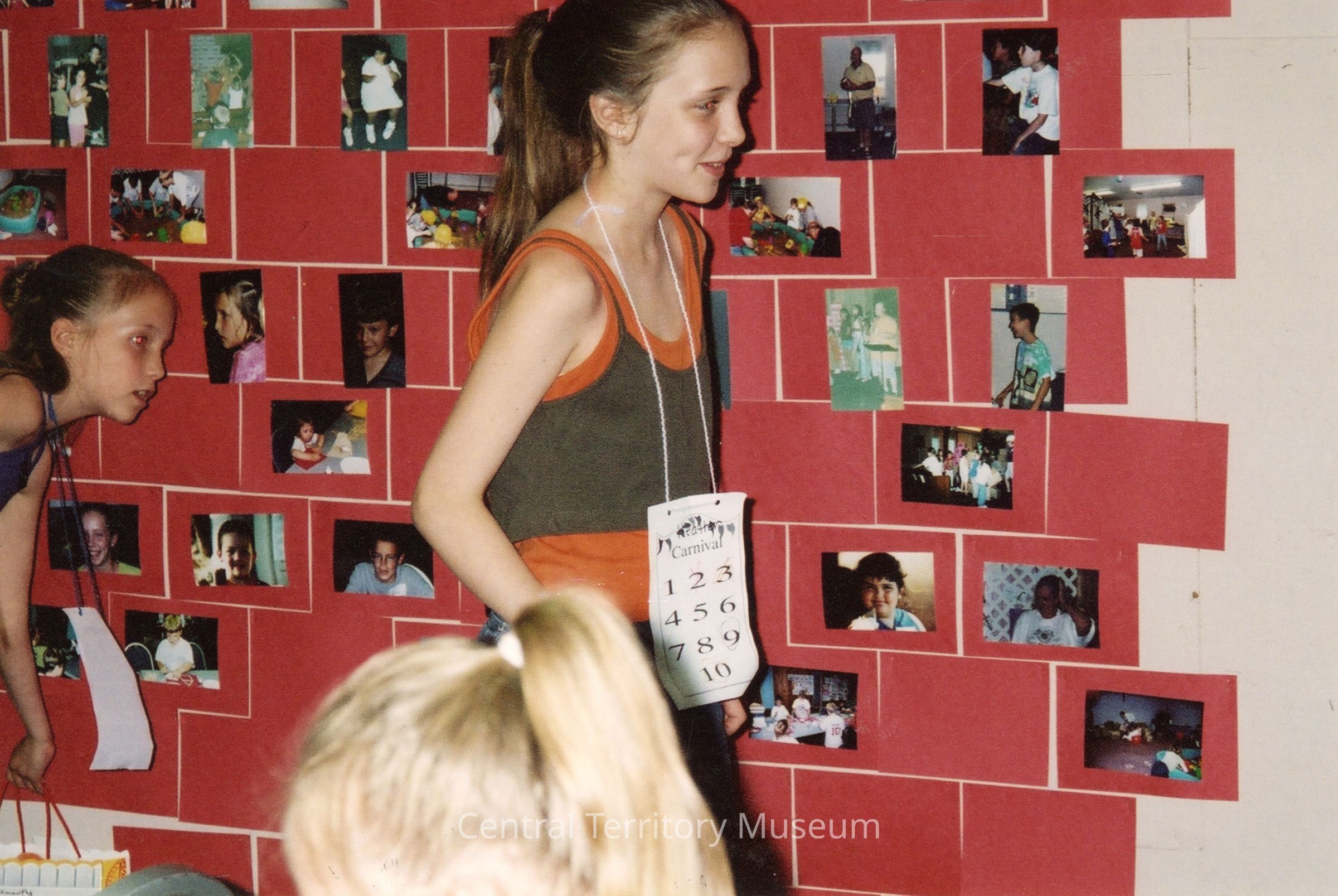 Color photo taken during a day camp hosted by the St. Charles (Tri-City), IL Corps. A girl, seen in profile, is walking in front of a wall decorated with pieces of red paper and photographs. She is wearing a bingo card on a string around her neck.