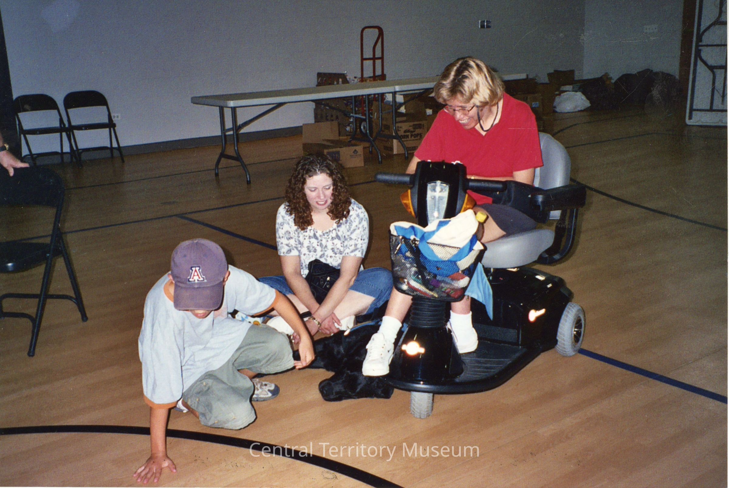 Color photo taken during a day camp hosted by the St. Charles (Tri-City), IL Corps. A boy and two adult women are inside the corps gymnasium. The boy, face obscured by a ball cap, is crouching down while a woman to his left is sitting cross legged on the floor. The other woman is seated in an electric wheelchair / scooter.Acquisition