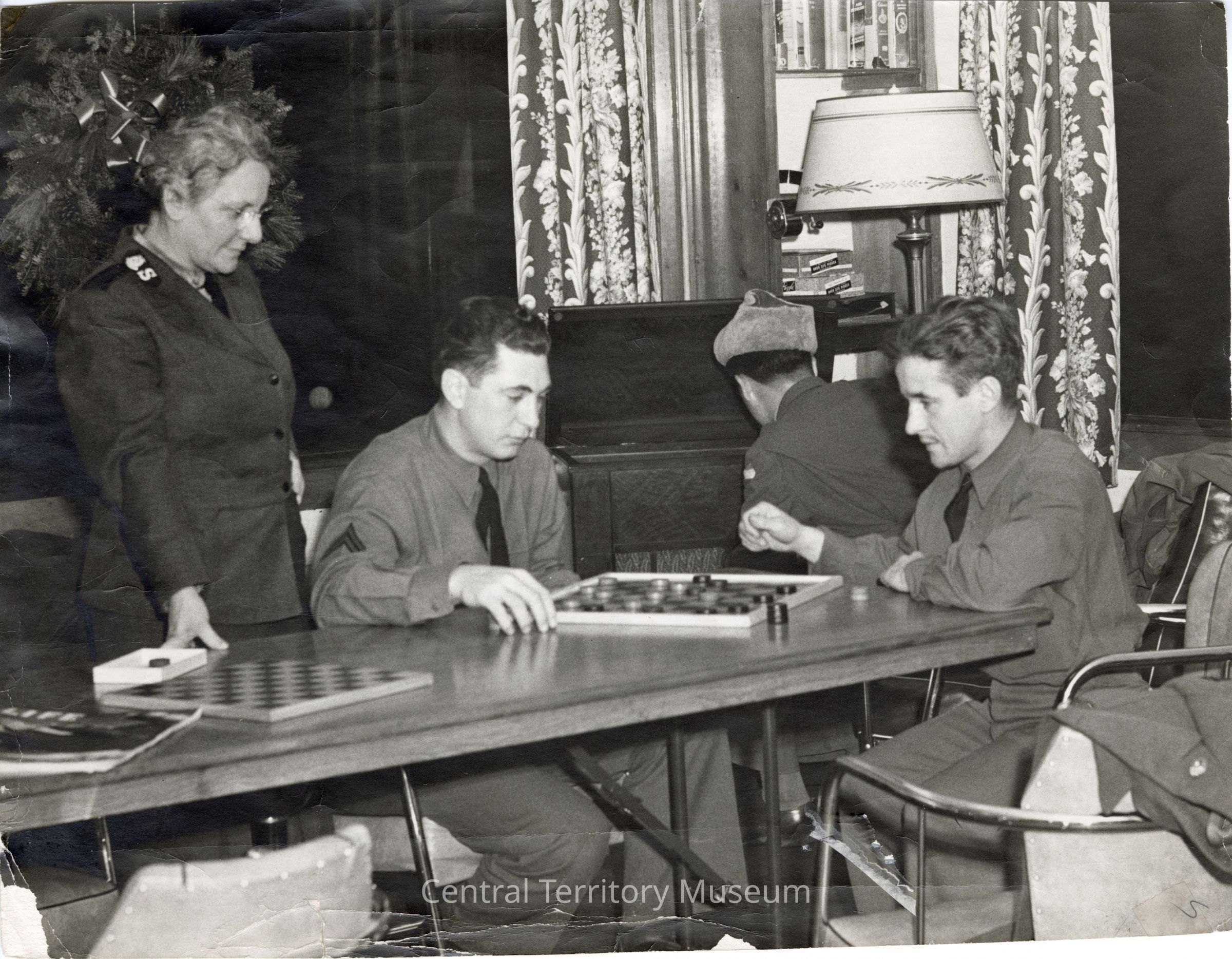 Photo of Major Cora Fitzgerald watching two servicemen playing a game of checkers at the Highwood, IL USO Club. Another soldier is seated near them, facing away. A holiday wreath hangs on the door behind Fitzgerald.