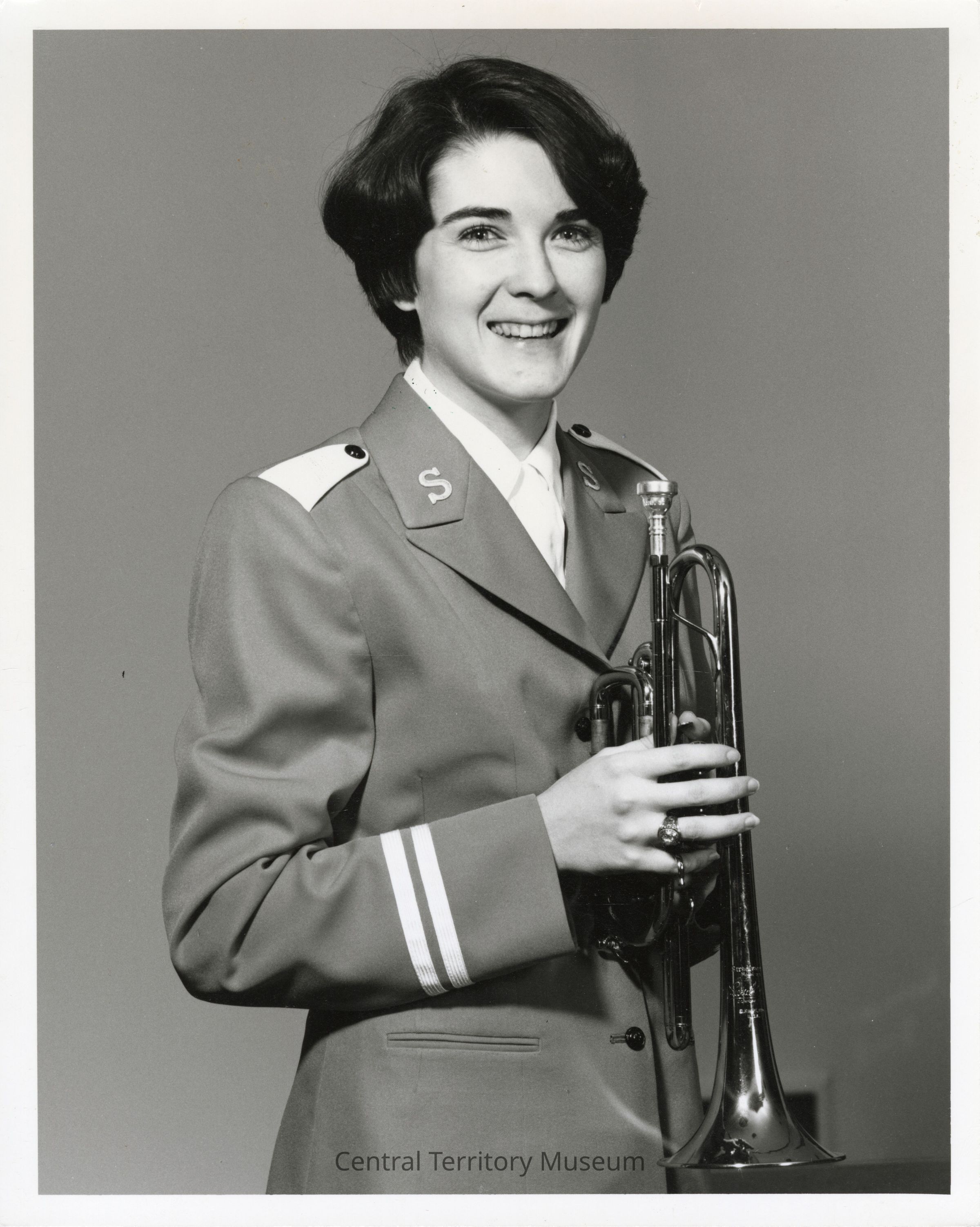 Formal photo of Peggy (Paton) Thomas, holding her cornet. She is wearing her band uniform which has white stripes around the sleeves near the cuffs, white shoulder tabs, and the initial letters "S" on either side of her collar. Her dark hair is styled in a bob cut.Acquisition