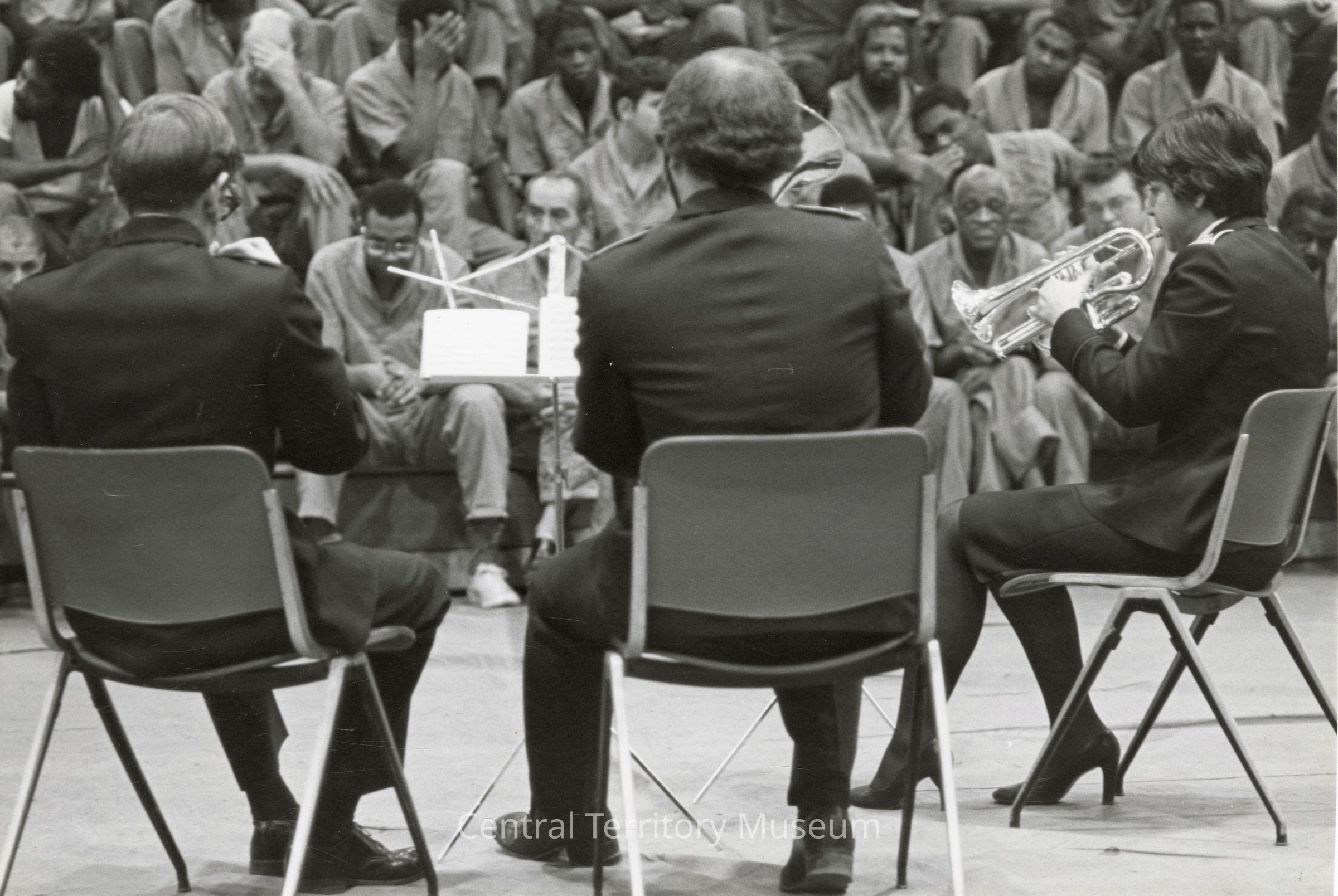 Photo taken during a performance by the Chicago Staff Band. The photographer is shooting across three musicians as they play toward a crowd of men. A handwritten note, in red ink, on the back of the photo reads "Playing at a prison".