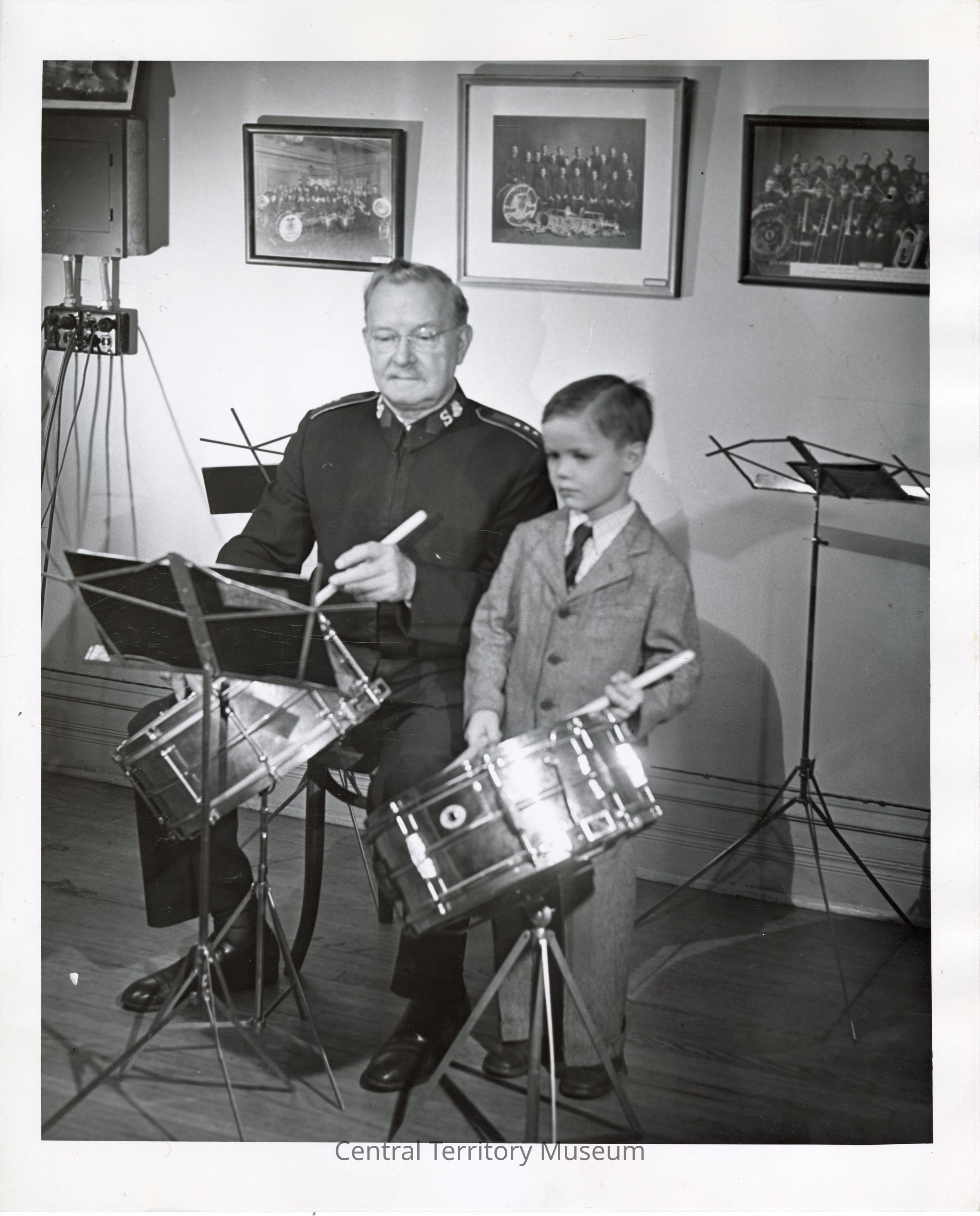 Photo of Hubert Burtenshaw, bandmaster of the Chicago Staff Band, and a young boy, behind a drum kit. Burtenshaw is seated, holding a drumstick against a small snare drum on a stand while the boy is standing, holding a drumstick against another snare drum. A music book, on a metal stand, is in front of them. Framed photos of the Chicago Staff Band hang on the wall behind them. A white border surrounds the photo on all four sides.