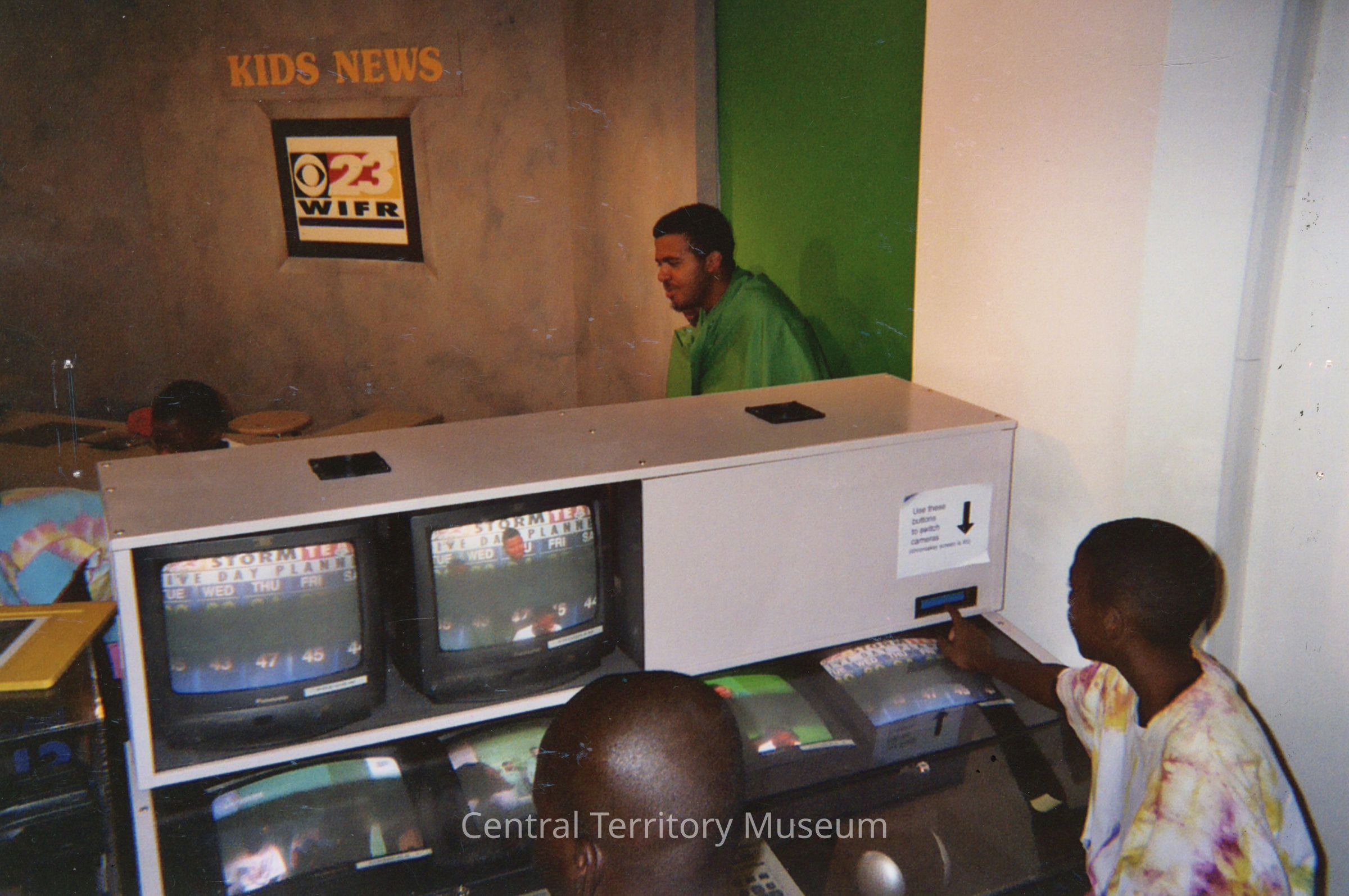 Color photo taken during a day camp hosted by the St. Charles (Tri-City), IL Corps. Two Black boys sit in front of a bank of monitors that show other people working on the broadcast desk on the other side. The wall in the background has a phrase "Kids News" with a station logo under it.