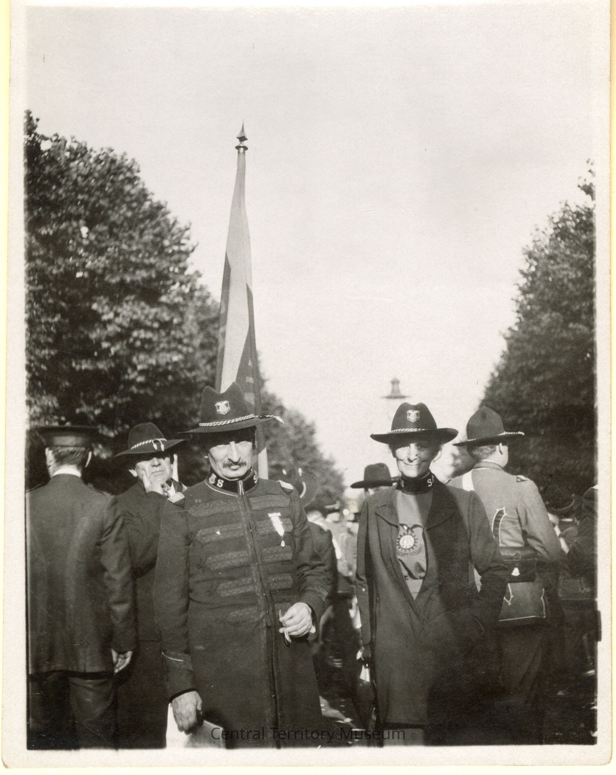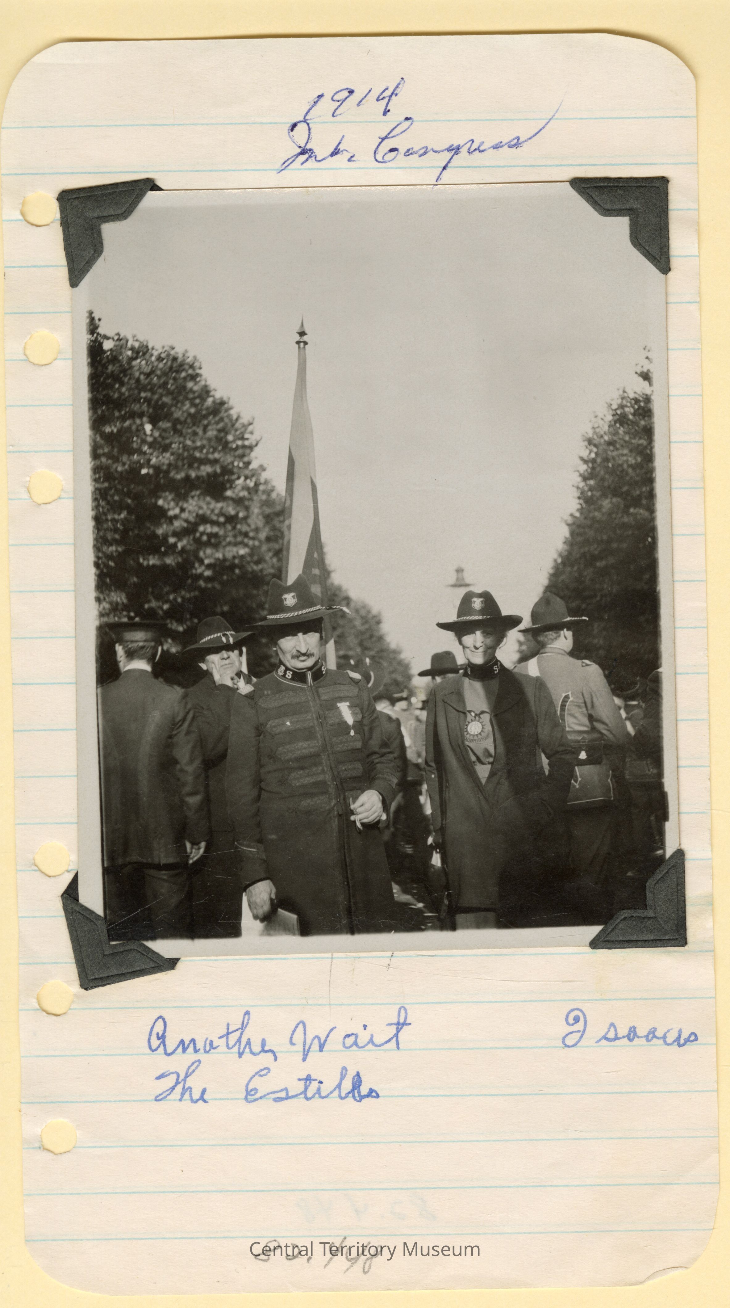 Scrapbook page with a photo of Thomas and Mary Estill, taken during the 1914 International Congress in London, England. Members of the Chicago Staff Band can be seen in the background.